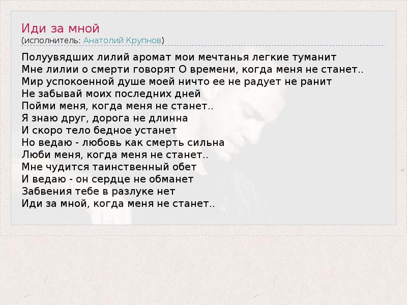 Полуувядших лилий аромат мои мечтанья легкие туманит Мне лилии о смерти говорят О времени, когда меня не станет.. Мир успокоенной душе моей ничто ее не радует не ранит Не забывай моих последних дней Пойми меня, когда меня не станет.. Я знаю друг, дорога не длинна И скоро тело бедное устанет Но ведаю - любовь как смерть сильна Люби меня, когда меня не станет.. Мне чудится таинственный обет И ведаю - он сердце не обманет Забвения тебе в разлуке нет Иди за мной, когда меня не станет..