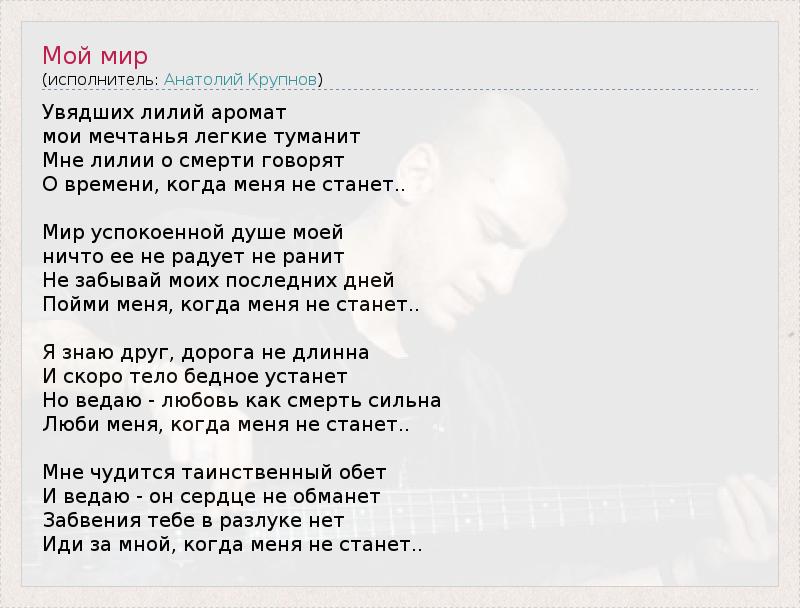 Увядших лилий аромат мои мечтанья легкие туманит Мне лилии о смерти говорят О времени, когда меня не станет.. Мир успокоенной душе моей ничто ее не радует не ранит Не забывай моих последних дней Пойми меня, когда меня не станет.. Я знаю друг, дорога не длинна И скоро тело бедное устанет Но ведаю - любовь как смерть сильна Люби меня, когда меня не станет.. Мне чудится таинственный обет И ведаю - он сердце не обманет Забвения тебе в разлуке нет Иди за мной, когда меня не станет..