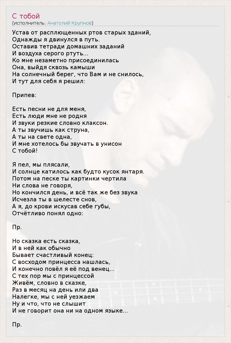 Устав от расплющенных ртов старых зданий, Однажды я двинулся в путь. Оставив тетради домашних заданий И воздуха серого ртуть... Ко мне незаметно присоединилась Она, выйдя сквозь камыши На солнечный берег, что Вам и не снилось, И тут для себя я решил: Припев: Есть песни не для меня, Есть люди мне не родня И звуки резкие словно клаксон. А ты звучишь как струна, А ты на свете одна, И мне хотелось бы звучать в унисон С тобой! Я пел, мы плясали, И солнце катилось как будто кусок янтаря. Потом на песке ты картинки чертила Ни слова не говоря, Но кончился день, и всё так же без звука Исчезла ты в шелесте снов, А я, до крови искусав себе губы, Отчётливо понял одно: Пр. Но сказка есть сказка, И в ней как обычно Бывает счастливый конец: С восходом принцесса нашлась, И конечно повёл я её под венец... С тех пор мы с принцессой Живём, словно в сказке, Раз в месяц на день или два Налегке, мы с ней уезжаем Ну и что, что не слышит И не говорит она ни на одном языке... Пр.