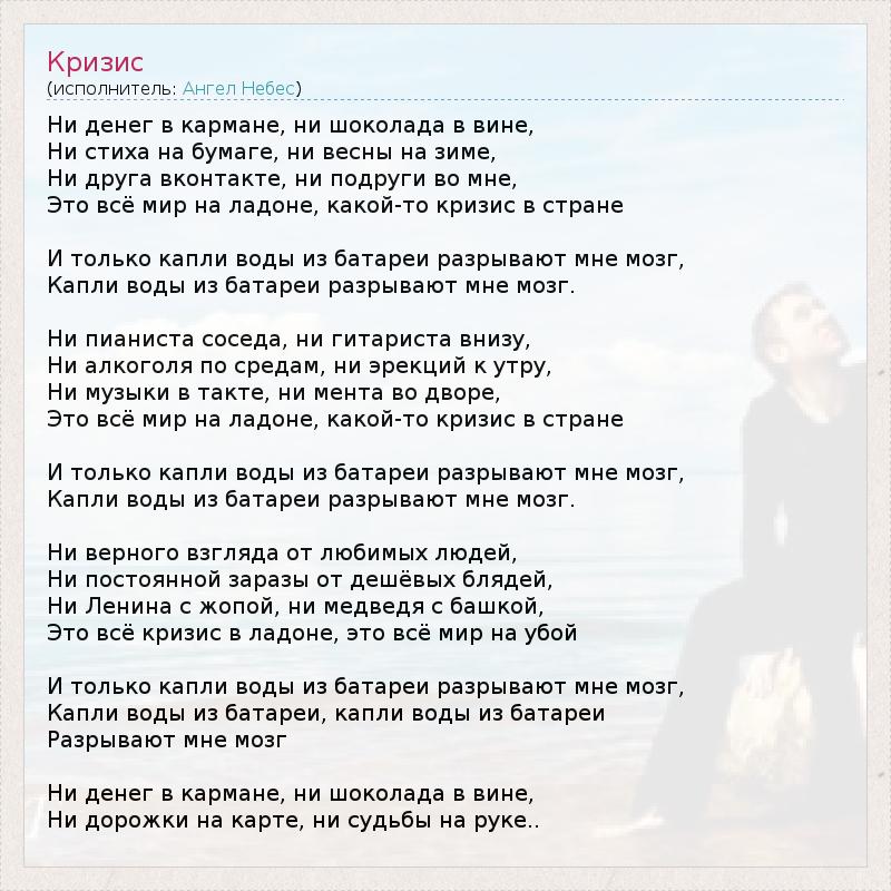 Ни денег в кармане, ни шоколада в вине, Ни стиха на бумаге, ни весны на зиме, Ни друга вконтакте, ни подруги во мне, Это всё мир на ладоне, какой-то кризис в стране И только капли воды из батареи разрывают мне мозг, Капли воды из батареи разрывают мне мозг. Ни пианиста соседа, ни гитариста внизу, Ни алкоголя по средам, ни эрекций к утру, Ни музыки в такте, ни мента во дворе, Это всё мир на ладоне, какой-то кризис в стране И только капли воды из батареи разрывают мне мозг, Капли воды из батареи разрывают мне мозг. Ни верного взгляда от любимых людей, Ни постоянной заразы от дешёвых блядей, Ни Ленина с жопой, ни медведя с башкой, Это всё кризис в ладоне, это всё мир на убой И только капли воды из батареи разрывают мне мозг, Капли воды из батареи, капли воды из батареи Разрывают мне мозг Ни денег в кармане, ни шоколада в вине, Ни дорожки на карте, ни судьбы на руке..