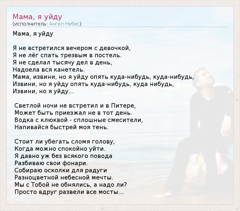 Мама, я уйду Я не встретился вечером с девочкой, Я не лёг спать трезвым в постель. Я не сделал тысячу дел в день, Надоела вся канетель. Мама, извини, но я уйду опять куда-нибудь, куда-нибудь, Извини, но я уйду опять куда-нибудь, куда нибудь, Извини, но я уйду... Светлой ночи не встретил и в Питере, Может быть приезжал не в тот день. Водка с клюквой - сплошные смесители, Напивайся быстрей моя тень. Стоит ли убегать сломя голову, Когда можно спокойно уйти. Я давно уж без всякого повода Разбиваю свои фонари. Собираю осколки для радуги Разноцветной небесной мечты. Мы с Тобой не обнялись, а надо ли? Просто вдруг развели все мосты...