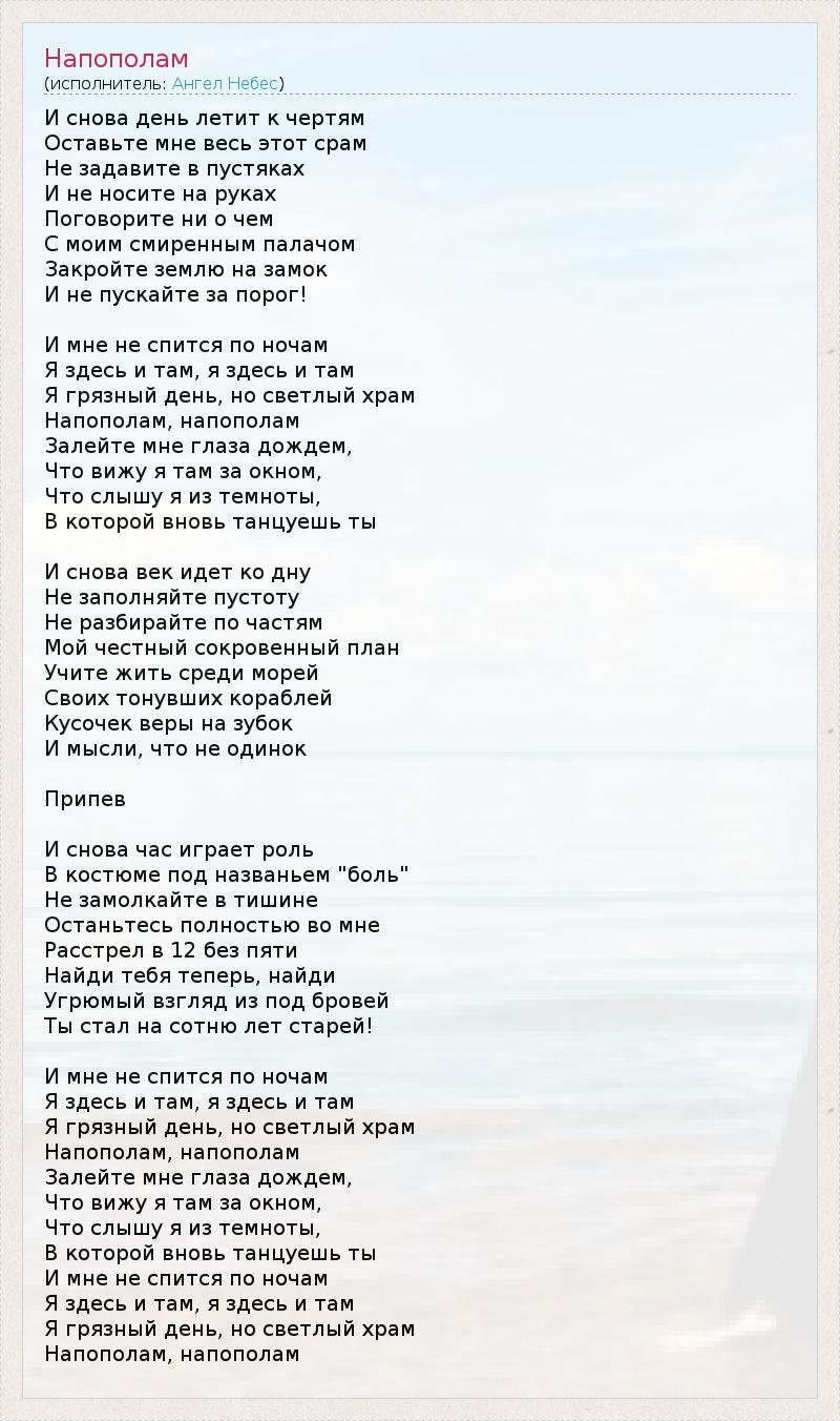 И снова день летит к чертям Оставьте мне весь этот срам Не задавите в пустяках И не носите на руках Поговорите ни о чем С моим смиренным палачом Закройте землю на замок И не пускайте за порог! И мне не спится по ночам Я здесь и там, я здесь и там Я грязный день, но светлый храм Напополам, напополам Залейте мне глаза дождем, Что вижу я там за окном, Что слышу я из темноты, В которой вновь танцуешь ты И снова век идет ко дну Не заполняйте пустоту Не разбирайте по частям Мой честный сокровенный план Учите жить среди морей Своих тонувших кораблей Кусочек веры на зубок И мысли, что не одинок Припев И снова час играет роль В костюме под названьем "боль" Не замолкайте в тишине Останьтесь полностью во мне Расстрел в 12 без пяти Найди тебя теперь, найди Угрюмый взгляд из под бровей Ты стал на сотню лет старей! И мне не спится по ночам Я здесь и там, я здесь и там Я грязный день, но светлый храм Напополам, напополам Залейте мне глаза дождем, Что вижу я там за окном, Что слышу я из темноты, В которой вновь танцуешь ты И мне не спится по ночам Я здесь и там, я здесь и там Я грязный день, но светлый храм Напополам, напополам