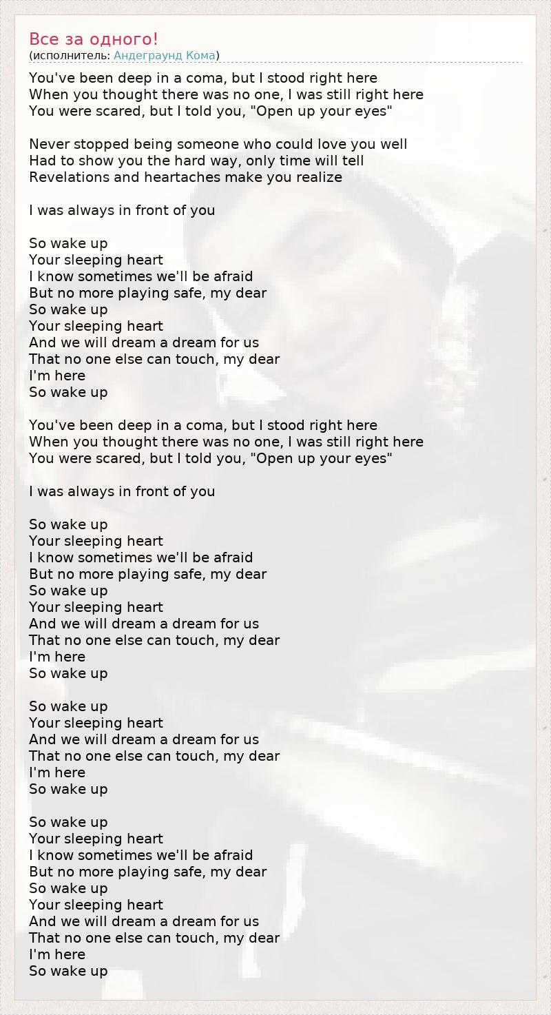 Ты пребывала в глубокой коме, но я был рядом. Когда ты думала, что вокруг никого, я был рядом. Ты была напугана, но я сказал тебе: "Открой глаза!" Меня ничто не остановило, я любил тебя больше всех, Я должен был дать тебе горький опыт, только время покажет, Откровения и сердечные муки помогут тебе понять: Я всегда стоял перед тобой. Разбуди же Свое спящее сердце. Я знаю: иногда нам будет страшно, Но мы больше не будем избегать риска, дорогая. Разбуди же Свое спящее сердце, И мы взлелеем для нас мечту, К которой никто не сможет приблизиться, дорогая. Я рядом, Очнись же. Ты пребывала в глубокой коме, но я был рядом. Когда ты думала, что вокруг никого, я был рядом. Ты была напугана, но я сказал тебе: "Открой глаза!" Я всегда стоял перед тобой. Разбуди же Свое спящее сердце. Я знаю: иногда нам будет страшно, Но мы больше не будем избегать риска, дорогая. Разбуди же Свое спящее сердце, И мы взлелеем для нас мечту, К которой никто не сможет приблизиться, дорогая. Я рядом, Очнись же. Разбуди же Свое спящее сердце, И мы взлелеем для нас мечту, К которой никто не сможет приблизиться, дорогая. Я рядом, Очнись же. Разбуди же Свое спящее сердце. Я знаю: иногда нам будет страшно, Но мы больше не будем избегать риска, дорогая. Разбуди же Свое спящее сердце, И мы взлелеем для нас мечту, К которой никто не сможет приблизиться, дорогая. Я рядом, Очнись же.
