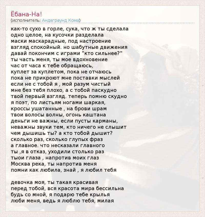 as a dry throat, bitch , what have you done a whole, in pieces SPLIT masquerade masks , mood look calm . but shabutnye movement let's get this over with games & quot; who is stronger ? & quot; You're part of me , you're my inspiration hour on the hour of talking to you , verse for verse , yet do not despair until it closed down I thought supply if not with you, I am , my mind clean me without you is bad, and you paskudno your first look. I remember now scantily I'm a poet , the leaves feet shuffling , ushatannye crosses , on the brow of a scar your hair wave , fire chestnut money is not important if the empty pockets sounds unimportant to those who can not hear than you breathe ? and who you breathing? how many times , how many stupid phrases and most importantly . unsaid that the main you , I'm in denial , went many times tyoi eyes , in front of my eyes Moscow river, you are in front of me remember how she loved, know that I loved you my girl, you're so beautiful in front of you , all the beauty of the world is powerless be with me , I'll give you wings love me , because I love you , my dear
