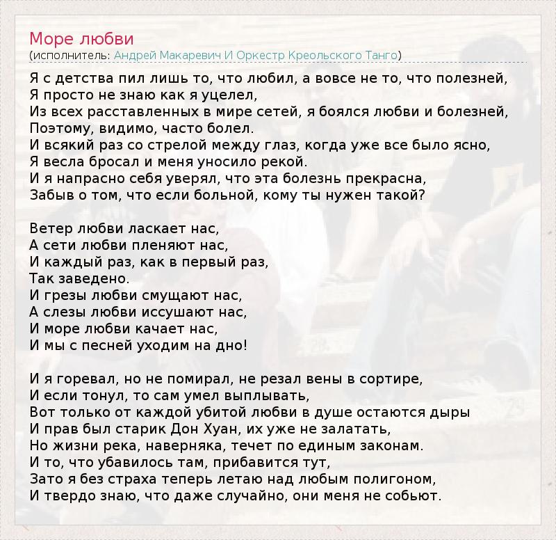 Я с детства пил лишь то, что любил, а вовсе не то, что полезней, Я просто не знаю как я уцелел, Из всех расставленных в мире сетей, я боялся любви и болезней, Поэтому, видимо, часто болел. И всякий раз со стрелой между глаз, когда уже все было ясно, Я весла бросал и меня уносило рекой. И я напрасно себя уверял, что эта болезнь прекрасна, Забыв о том, что если больной, кому ты нужен такой? Ветер любви ласкает нас, А сети любви пленяют нас, И каждый раз, как в первый раз, Так заведено. И грезы любви смущают нас, А слезы любви иссушают нас, И море любви качает нас, И мы с песней уходим на дно! И я горевал, но не помирал, не резал вены в сортире, И если тонул, то сам умел выплывать, Вот только от каждой убитой любви в душе остаются дыры И прав был старик Дон Хуан, их уже не залатать, Но жизни река, наверняка, течет по единым законам. И то, что убавилось там, прибавится тут, Зато я без страха теперь летаю над любым полигоном, И твердо знаю, что даже случайно, они меня не собьют.