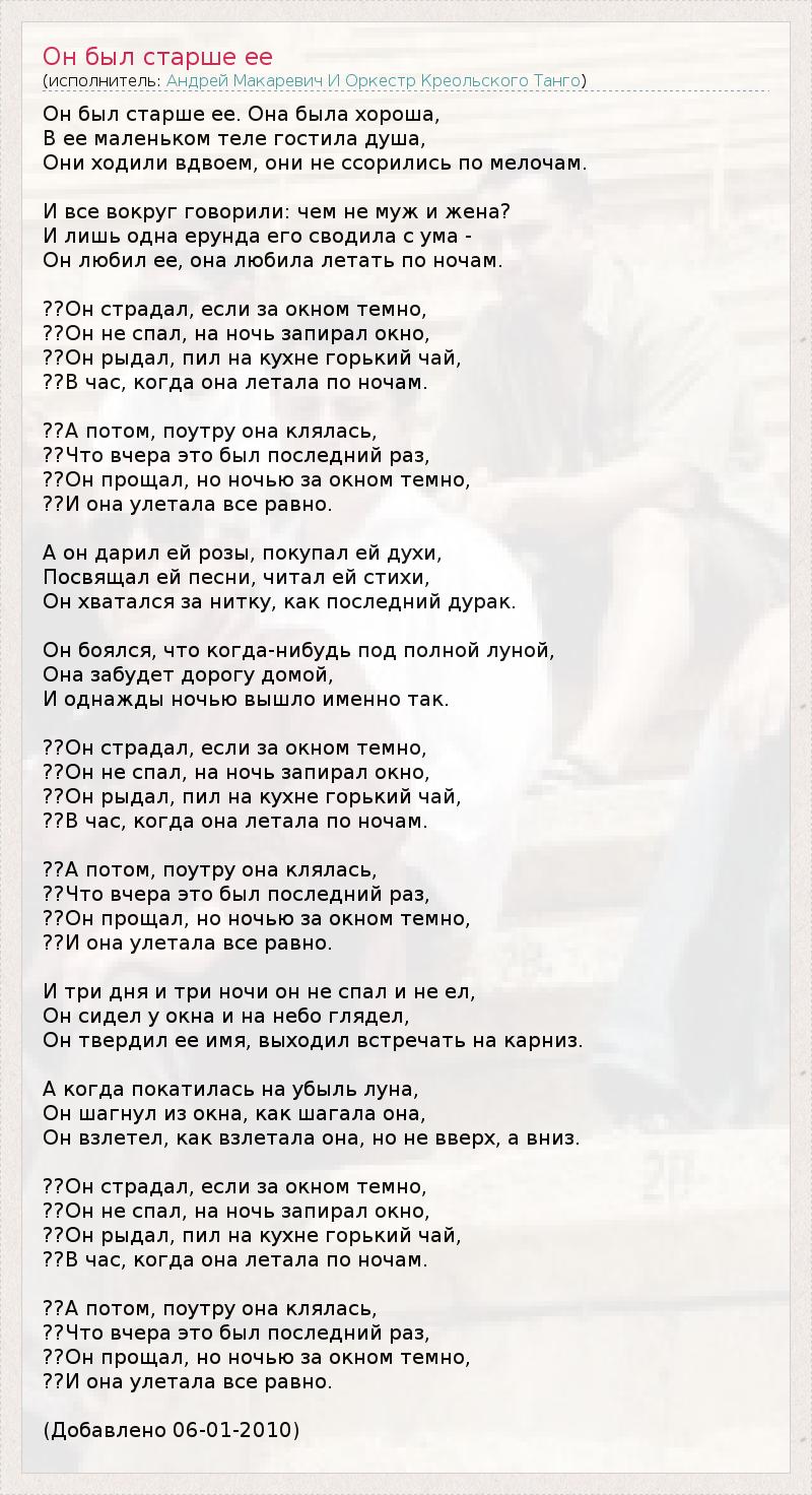 Он был старше ее. Она была хороша, В ее маленьком теле гостила душа, Они ходили вдвоем, они не ссорились по мелочам. И все вокруг говорили: чем не муж и жена? И лишь одна ерунда его сводила с ума - Он любил ее, она любила летать по ночам. ??Он страдал, если за окном темно, ??Он не спал, на ночь запирал окно, ??Он рыдал, пил на кухне горький чай, ??В час, когда она летала по ночам. ??А потом, поутру она клялась, ??Что вчера это был последний раз, ??Он прощал, но ночью за окном темно, ??И она улетала все равно. А он дарил ей розы, покупал ей духи, Посвящал ей песни, читал ей стихи, Он хватался за нитку, как последний дурак. Он боялся, что когда-нибудь под полной луной, Она забудет дорогу домой, И однажды ночью вышло именно так. ??Он страдал, если за окном темно, ??Он не спал, на ночь запирал окно, ??Он рыдал, пил на кухне горький чай, ??В час, когда она летала по ночам. ??А потом, поутру она клялась, ??Что вчера это был последний раз, ??Он прощал, но ночью за окном темно, ??И она улетала все равно. И три дня и три ночи он не спал и не ел, Он сидел у окна и на небо глядел, Он твердил ее имя, выходил встречать на карниз. А когда покатилась на убыль луна, Он шагнул из окна, как шагала она, Он взлетел, как взлетала она, но не вверх, а вниз. ??Он страдал, если за окном темно, ??Он не спал, на ночь запирал окно, ??Он рыдал, пил на кухне горький чай, ??В час, когда она летала по ночам. ??А потом, поутру она клялась, ??Что вчера это был последний раз, ??Он прощал, но ночью за окном темно, ??И она улетала все равно. (Добавлено 06-01-2010)