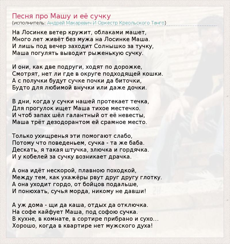 А как ты думаешь, о чем песня "Песня про Машу и её сучку" ?