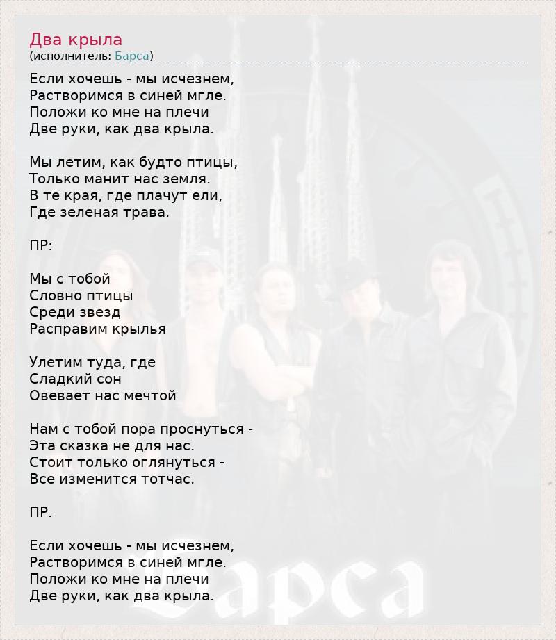 Если хочешь - мы исчезнем, Растворимся в синей мгле. Положи ко мне на плечи Две руки, как два крыла. Мы летим, как будто птицы, Только манит нас земля. В те края, где плачут ели, Где зеленая трава. ПР: Мы с тобой Словно птицы Среди звезд Расправим крылья Улетим туда, где Сладкий сон Овевает нас мечтой Нам с тобой пора проснуться - Эта сказка не для нас. Стоит только оглянуться - Все изменится тотчас. ПР. Если хочешь - мы исчезнем, Растворимся в синей мгле. Положи ко мне на плечи Две руки, как два крыла.