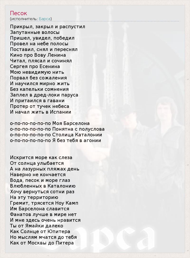 Прикрыл, закрыл и распустил Запутанные волосы Пришел, увидел, победил Провел на небе полосы Поставил, снял и переснял Кино про Вову Ленина Читал, плясал и сочинял Сергея про Есенина Мою невидимую нить Порвал без сожаления И научился мирно жить Без капельки сомнения Заплел в дред-локи паруса И притаился в гавани Протер от тучек небеса И начал жить в Испании о-по-по-по-по-по Моя Барселона о-по-по-по-по-по Понятна с полуслова о-по-по-по-по-по Столица Каталонии о-по-по-по-по-по Я без тебя в агонии Искрится море как слеза От солнца улыбается А на лазурных пляжах день Наверно не кончается Вода, песок и море глаз Влюбленных в Каталонию Хочу вернуться сотни раз На эту территорию Гремит, трясется Ноу Камп Им Барселона славится Фанатов лучше в мире нет И мне здесь очень нравится Ты от Ямайки далеко Как Солнце от Юпитера Но мыслям мчатся до тебя Как от Москвы до Питера