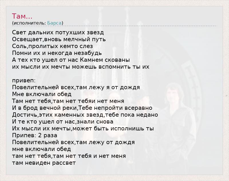 Свет дальних потухших звезд Освещает,вновь мелчный путь Соль,пролитых кемто слез Помни их и некогда незабудь А тех кто ушел от нас Камнем скованы их мысли их мечты можешь вспомнить ты их привеп: Повелительней всех,там лежу я от дождя Мне включали обед Там нет тебя,там нет тебяи нет меня И в брод вечной реки,Тебе непройти всеравно Достичь,этих каменных звезд,тебе пока недано И те кто ушел от нас,знали снова Их мысли их мечты,может быть исполнишь ты Припев: 2 раза Повелительней всех,там лежу от дождя мне включали обед там нет тебя,там нет тебя и нет меня там невиден рассвет