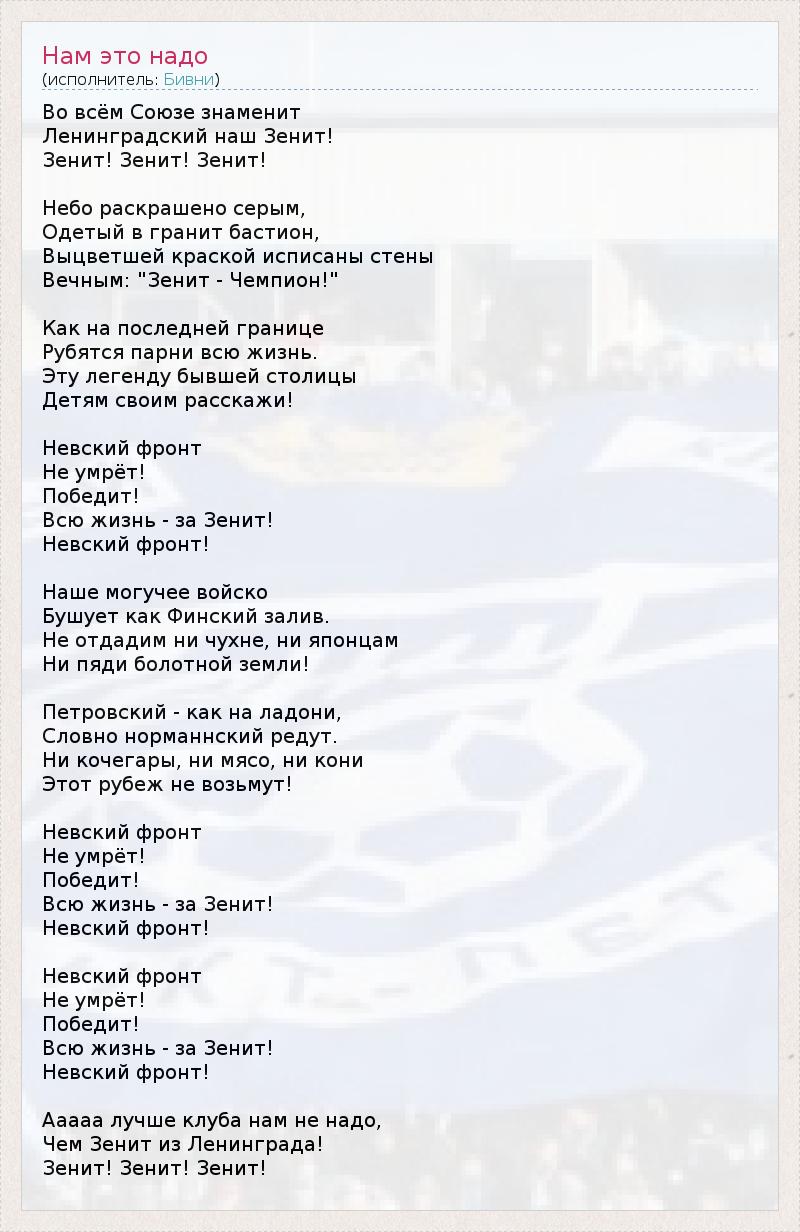 Во всём Союзе знаменит Ленинградский наш Зенит! Зенит! Зенит! Зенит! Небо раскрашено серым, Одетый в гранит бастион, Выцветшей краской исписаны стены Вечным: "Зенит - Чемпион!" Как на последней границе Рубятся парни всю жизнь. Эту легенду бывшей столицы Детям своим расскажи! Невский фронт Не умрёт! Победит! Всю жизнь - за Зенит! Невский фронт! Наше могучее войско Бушует как Финский залив. Не отдадим ни чухне, ни японцам Ни пяди болотной земли! Петровский - как на ладони, Словно норманнский редут. Ни кочегары, ни мясо, ни кони Этот рубеж не возьмут! Невский фронт Не умрёт! Победит! Всю жизнь - за Зенит! Невский фронт! Невский фронт Не умрёт! Победит! Всю жизнь - за Зенит! Невский фронт! Ааааа лучше клуба нам не надо, Чем Зенит из Ленинграда! Зенит! Зенит! Зенит!