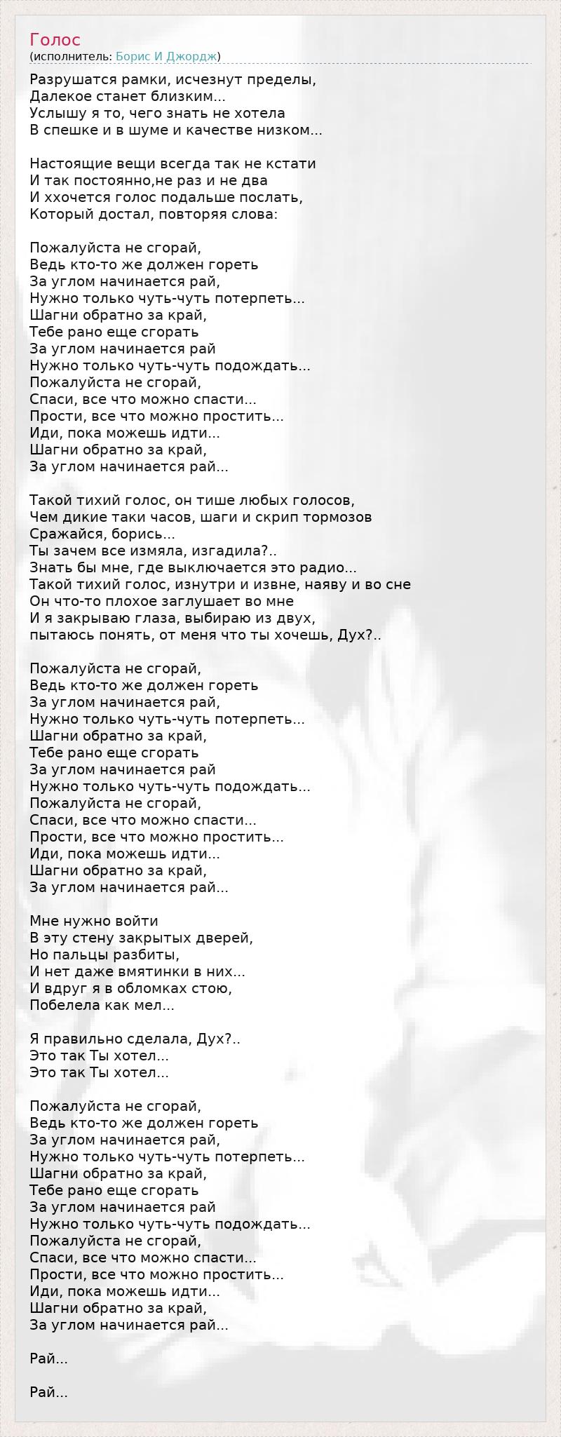 Разрушатся рамки, исчезнут пределы, Далекое станет близким... Услышу я то, чего знать не хотела В спешке и в шуме и качестве низком... Настоящие вещи всегда так не кстати И так постоянно,не раз и не два И ххочется голос подальше послать, Который достал, повторяя слова: Пожалуйста не сгорай, Ведь кто-то же должен гореть За углом начинается рай, Нужно только чуть-чуть потерпеть... Шагни обратно за край, Тебе рано еще сгорать За углом начинается рай Нужно только чуть-чуть подождать... Пожалуйста не сгорай, Спаси, все что можно спасти... Прости, все что можно простить... Иди, пока можешь идти... Шагни обратно за край, За углом начинается рай... Такой тихий голос, он тише любых голосов, Чем дикие таки часов, шаги и скрип тормозов Сражайся, борись... Ты зачем все измяла, изгадила?.. Знать бы мне, где выключается это радио... Такой тихий голос, изнутри и извне, наяву и во сне Он что-то плохое заглушает во мне И я закрываю глаза, выбираю из двух, пытаюсь понять, от меня что ты хочешь, Дух?.. Пожалуйста не сгорай, Ведь кто-то же должен гореть За углом начинается рай, Нужно только чуть-чуть потерпеть... Шагни обратно за край, Тебе рано еще сгорать За углом начинается рай Нужно только чуть-чуть подождать... Пожалуйста не сгорай, Спаси, все что можно спасти... Прости, все что можно простить... Иди, пока можешь идти... Шагни обратно за край, За углом начинается рай... Мне нужно войти В эту стену закрытых дверей, Но пальцы разбиты, И нет даже вмятинки в них... И вдруг я в обломках стою, Побелела как мел... Я правильно сделала, Дух?.. Это так Ты хотел... Это так Ты хотел... Пожалуйста не сгорай, Ведь кто-то же должен гореть За углом начинается рай, Нужно только чуть-чуть потерпеть... Шагни обратно за край, Тебе рано еще сгорать За углом начинается рай Нужно только чуть-чуть подождать... Пожалуйста не сгорай, Спаси, все что можно спасти... Прости, все что можно простить... Иди, пока можешь идти... Шагни обратно за край, За углом начинается рай... Рай... Рай...