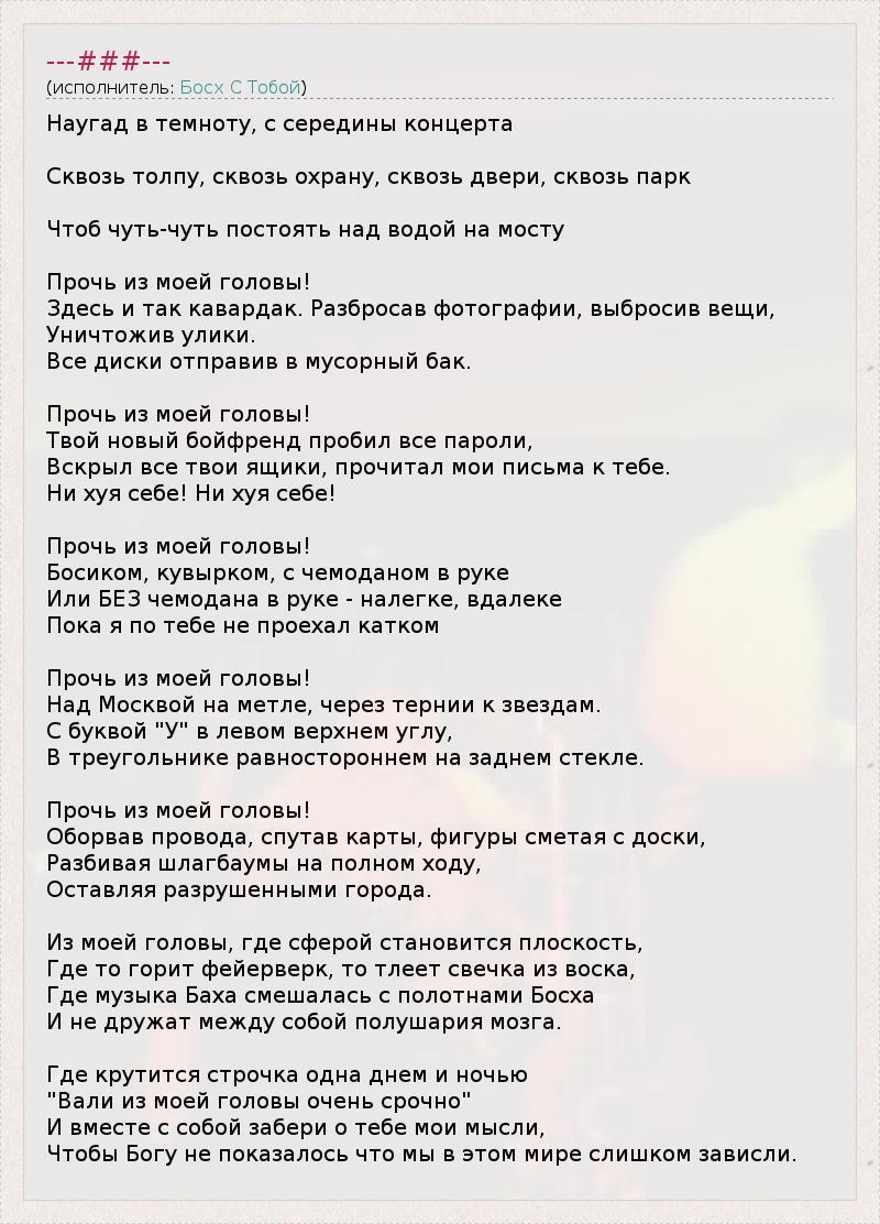 Наугад в темноту, c середины концерта Сквозь толпу, сквозь охрану, сквозь двери, сквозь парк Чтоб чуть-чуть постоять над водой на мосту Прочь из моей головы! Здесь и так кавардак. Разбросав фотографии, выбросив вещи, Уничтожив улики. Все диски отправив в мусорный бак. Прочь из моей головы! Твой новый бойфренд пробил все пароли, Вскрыл все твои ящики, прочитал мои письма к тебе. Ни хуя себе! Ни хуя себе! Прочь из моей головы! Босиком, кувырком, с чемоданом в руке Или БЕЗ чемодана в руке - налегке, вдалеке Пока я по тебе не проехал катком Прочь из моей головы! Над Москвой на метле, через тернии к звездам. С буквой "У" в левом верхнем углу, В треугольнике равностороннем на заднем стекле. Прочь из моей головы! Оборвав провода, спутав карты, фигуры сметая с доски, Разбивая шлагбаумы на полном ходу, Оставляя разрушенными города. Из моей головы, где сферой становится плоскость, Где то горит фейерверк, то тлеет свечка из воска, Где музыка Баха смешалась с полотнами Босха И не дружат между собой полушария мозга. Где крутится строчка одна днем и ночью "Вали из моей головы очень срочно" И вместе с собой забери о тебе мои мысли, Чтобы Богу не показалось что мы в этом мире слишком зависли.