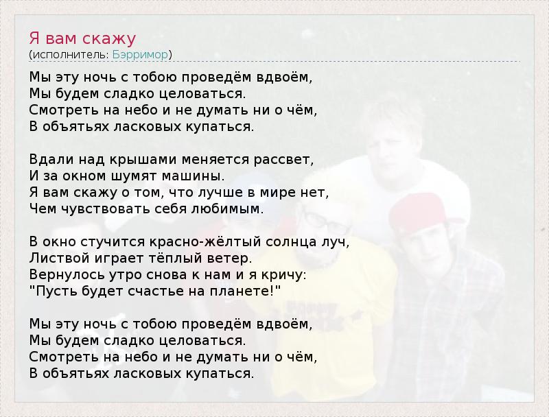 Мы эту ночь с тобою проведём вдвоём, Мы будем сладко целоваться. Смотреть на небо и не думать ни о чём, В объятьях ласковых купаться. Вдали над крышами меняется рассвет, И за окном шумят машины. Я вам скажу о том, что лучше в мире нет, Чем чувствовать себя любимым. В окно стучится красно-жёлтый солнца луч, Листвой играет тёплый ветер. Вернулось утро снова к нам и я кричу: "Пусть будет счастье на планете!" Мы эту ночь с тобою проведём вдвоём, Мы будем сладко целоваться. Смотреть на небо и не думать ни о чём, В объятьях ласковых купаться.