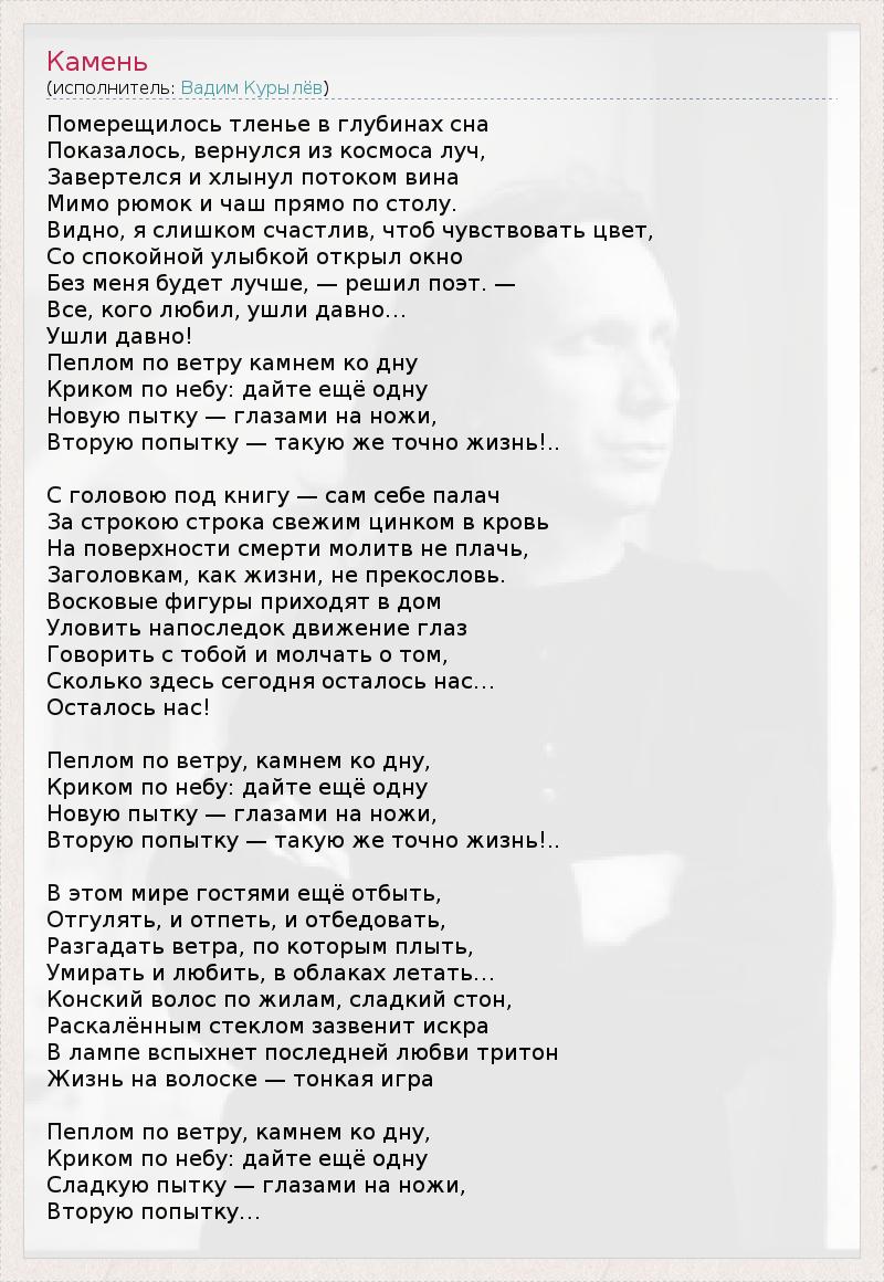 Совсем старая песня, написанная лет 25 назад и посвященная молодежно-студенческим бунтам конца 60-х. Входила в альбом «Тусклое Солнце» в акустической версии. В последнее время на концертах мы играли вот такой жесткий вариант «Камня» и решили, что в таком звучании песня очень подходит для нового альбома.