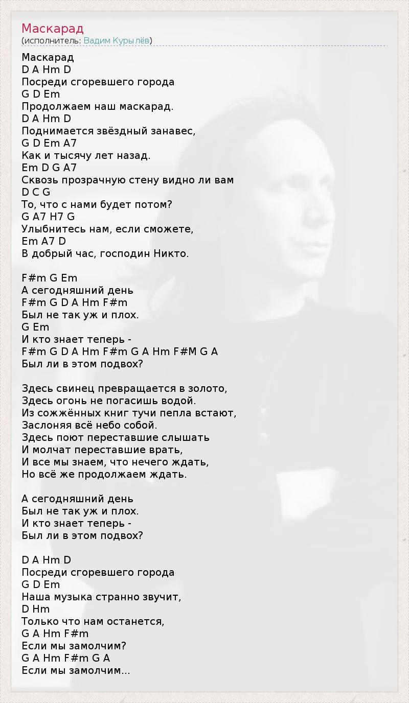 Маскарад D А Hm D Посреди сгоревшего города G D Em Продолжаем наш маскарад. D A Hm D Поднимается звёздный занавес, G D Em A7 Как и тысячу лет назад. Em D G A7 Сквозь прозрачную стену видно ли вам D C G То, что с нами будет потом? G A7 H7 G Улыбнитесь нам, если сможете, Em A7 D В добрый час, господин Никто. F#m G Em А сегодняшний день F#m G D A Hm F#m Был не так уж и плох. G Em И кто знает теперь - F#m G D A Hm F#m G A Hm F#M G A Был ли в этом подвох? Здесь свинец превращается в золото, Здесь огонь не погасишь водой. Из сожжённых книг тучи пепла встают, Заслоняя всё небо собой. Здесь поют переставшие слышать И молчат переставшие врать, И все мы знаем, что нечего ждать, Но всё же продолжаем ждать. А сегодняшний день Был не так уж и плох. И кто знает теперь - Был ли в этом подвох? D A Hm D Посреди сгоревшего города G D Em Наша музыка странно звучит, D Hm Только что нам останется, G A Hm F#m Если мы замолчим? G A Hm F#m G A Если мы замолчим...