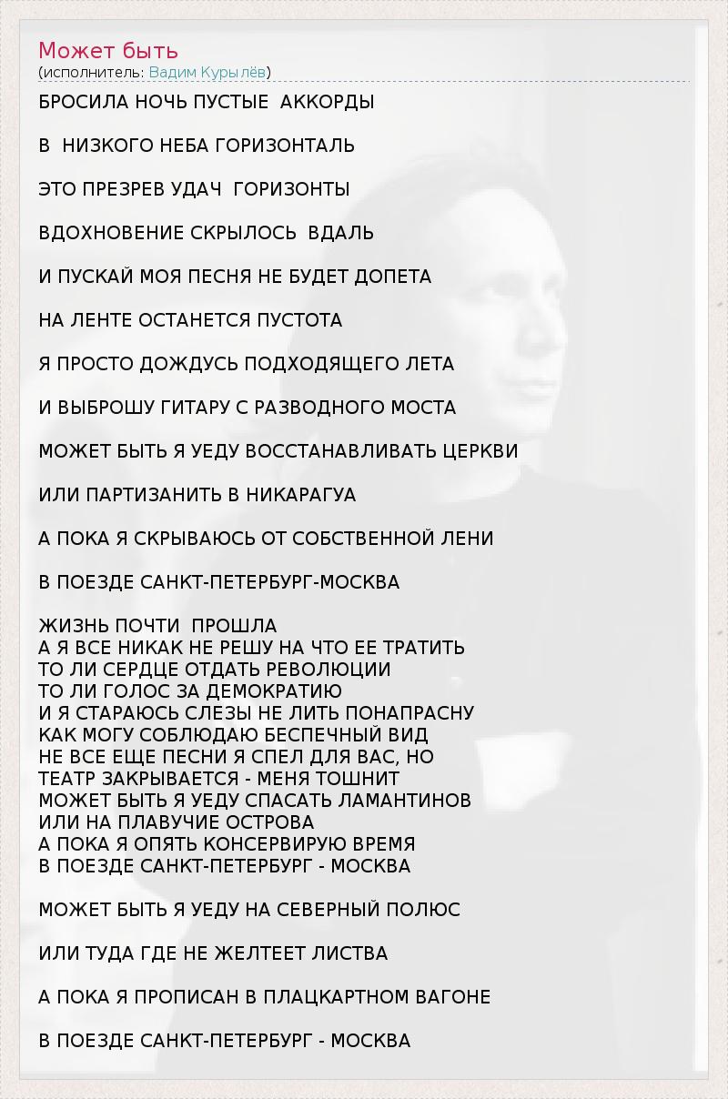 БРОСИЛА НОЧЬ ПУСТЫЕ АККОРДЫ В НИЗКОГО НЕБА ГОРИЗОНТАЛЬ ЭТО ПРЕЗРЕВ УДАЧ ГОРИЗОНТЫ ВДОХНОВЕНИЕ СКРЫЛОСЬ ВДАЛЬ И ПУСКАЙ МОЯ ПЕСНЯ НЕ БУДЕТ ДОПЕТА НА ЛЕНТЕ ОСТАНЕТСЯ ПУСТОТА Я ПРОСТО ДОЖДУСЬ ПОДХОДЯЩЕГО ЛЕТА И ВЫБРОШУ ГИТАРУ С РАЗВОДНОГО МОСТА МОЖЕТ БЫТЬ Я УЕДУ ВОССТАНАВЛИВАТЬ ЦЕРКВИ ИЛИ ПАРТИЗАНИТЬ В НИКАРАГУА А ПОКА Я СКРЫВАЮСЬ ОТ СОБСТВЕННОЙ ЛЕНИ В ПОЕЗДЕ САНКТ-ПЕТЕРБУРГ-МОСКВА ЖИЗНЬ ПОЧТИ ПРОШЛА А Я ВСЕ НИКАК НЕ РЕШУ НА ЧТО ЕЕ ТРАТИТЬ ТО ЛИ СЕРДЦЕ ОТДАТЬ РЕВОЛЮЦИИ ТО ЛИ ГОЛОС ЗА ДЕМОКРАТИЮ И Я СТАРАЮСЬ СЛЕЗЫ НЕ ЛИТЬ ПОНАПРАСНУ КАК МОГУ СОБЛЮДАЮ БЕСПЕЧНЫЙ ВИД НЕ ВСЕ ЕЩЕ ПЕСНИ Я СПЕЛ ДЛЯ ВАС, НО ТЕАТР ЗАКРЫВАЕТСЯ - МЕНЯ ТОШНИТ МОЖЕТ БЫТЬ Я УЕДУ СПАСАТЬ ЛАМАНТИНОВ ИЛИ НА ПЛАВУЧИЕ ОСТРОВА А ПОКА Я ОПЯТЬ КОНСЕРВИРУЮ ВРЕМЯ В ПОЕЗДЕ САНКТ-ПЕТЕРБУРГ - МОСКВА МОЖЕТ БЫТЬ Я УЕДУ НА СЕВЕРНЫЙ ПОЛЮС ИЛИ ТУДА ГДЕ НЕ ЖЕЛТЕЕТ ЛИСТВА А ПОКА Я ПРОПИСАН В ПЛАЦКАРТНОМ ВАГОНЕ В ПОЕЗДЕ САНКТ-ПЕТЕРБУРГ - МОСКВА