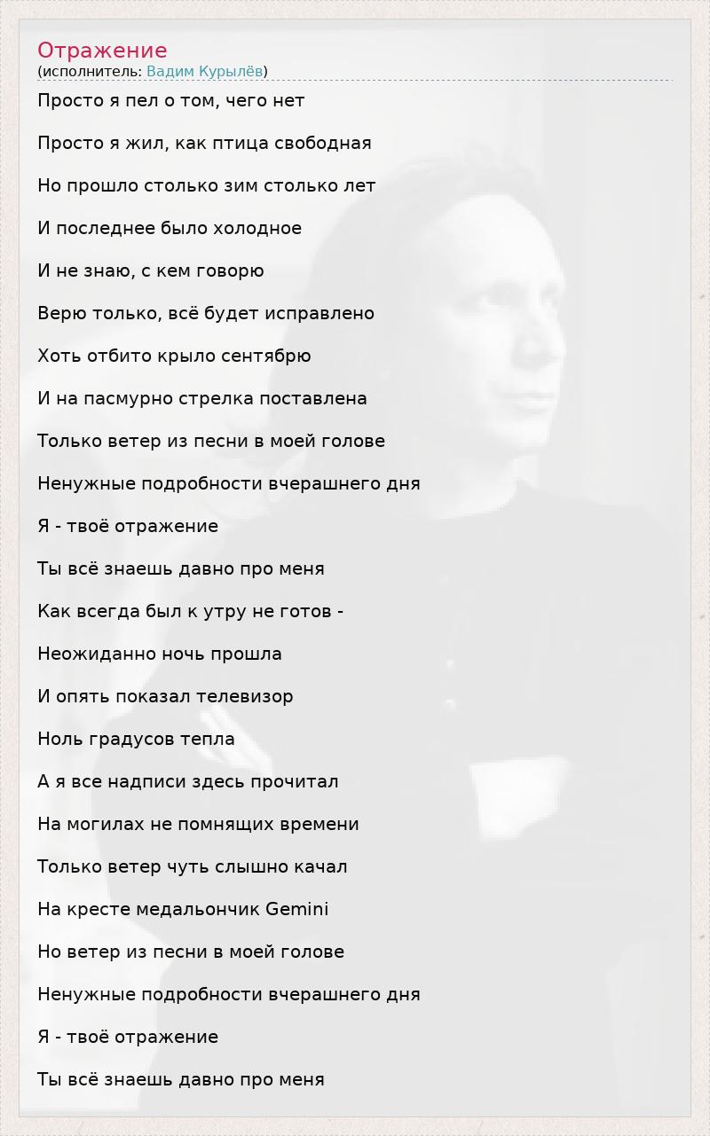 Просто я пел о том, чего нет Просто я жил, как птица свободная Но прошло столько зим столько лет И последнее было холодное И не знаю, с кем говорю Верю только, всё будет исправлено Хоть отбито крыло сентябрю И на пасмурно стрелка поставлена Только ветер из песни в моей голове Ненужные подробности вчерашнего дня Я - твоё отражение Ты всё знаешь давно про меня Как всегда был к утру не готов - Неожиданно ночь прошла И опять показал телевизор Ноль градусов тепла А я все надписи здесь прочитал На могилах не помнящих времени Только ветер чуть слышно качал На кресте медальончик Gemini Но ветер из песни в моей голове Ненужные подробности вчерашнего дня Я - твоё отражение Ты всё знаешь давно про меня