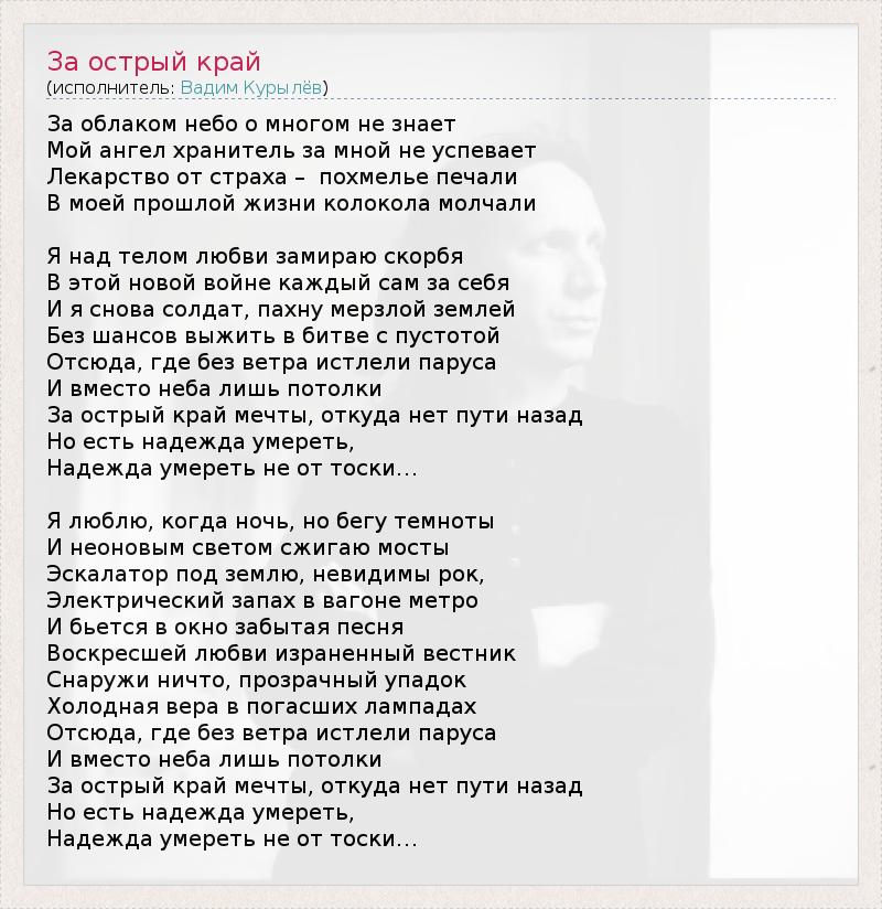 За облаком небо о многом не знает Мой ангел хранитель за мной не успевает Лекарство от страха – похмелье печали В моей прошлой жизни колокола молчали Я над телом любви замираю скорбя В этой новой войне каждый сам за себя И я снова солдат, пахну мерзлой землей Без шансов выжить в битве с пустотой Отсюда, где без ветра истлели паруса И вместо неба лишь потолки За острый край мечты, откуда нет пути назад Но есть надежда умереть, Надежда умереть не от тоски… Я люблю, когда ночь, но бегу темноты И неоновым светом сжигаю мосты Эскалатор под землю, невидимы рок, Электрический запах в вагоне метро И бьется в окно забытая песня Воскресшей любви израненный вестник Снаружи ничто, прозрачный упадок Холодная вера в погасших лампадах Отсюда, где без ветра истлели паруса И вместо неба лишь потолки За острый край мечты, откуда нет пути назад Но есть надежда умереть, Надежда умереть не от тоски…