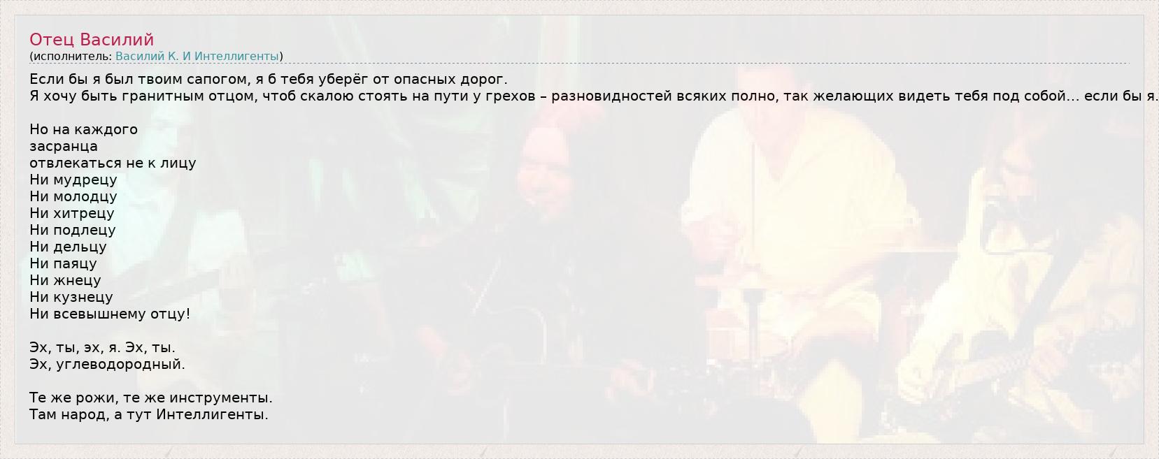 Если бы я был твоим сапогом, я б тебя уберёг от опасных дорог. Я хочу быть гранитным отцом, чтоб скалою стоять на пути у грехов – разновидностей всяких полно, так желающих видеть тебя под собой… если бы я. Но на каждого засранца отвлекаться не к лицу Ни мудрецу Ни молодцу Ни хитрецу Ни подлецу Ни дельцу Ни паяцу Ни жнецу Ни кузнецу Ни всевышнему отцу! Эх, ты, эх, я. Эх, ты. Эх, углеводородный. Те же рожи, те же инструменты. Там народ, а тут Интеллигенты.