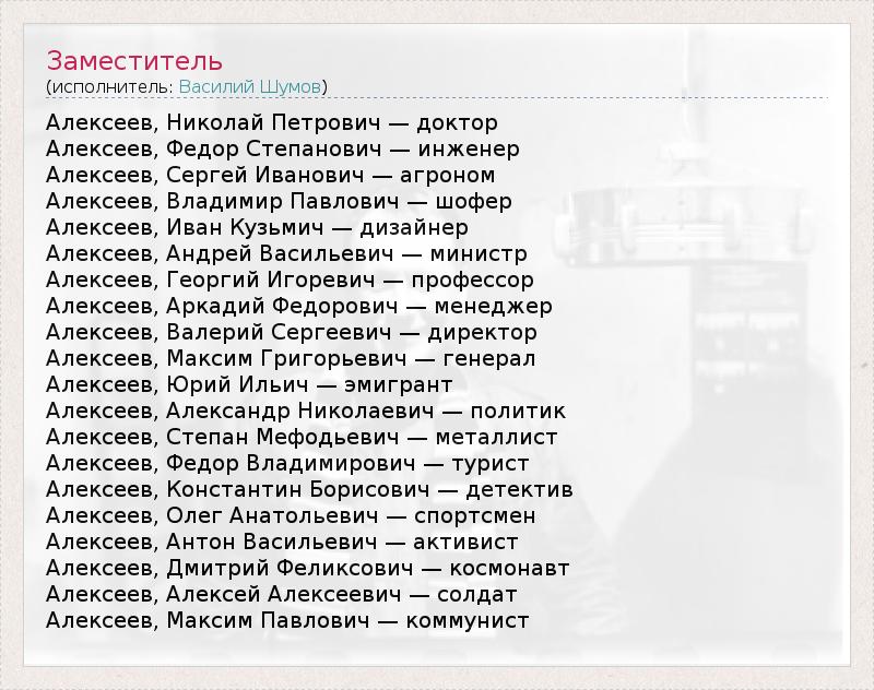 Алексеев, Николай Петрович — доктор Алексеев, Федор Степанович — инженер Алексеев, Сергей Иванович — агроном Алексеев, Владимир Павлович — шофер Алексеев, Иван Кузьмич — дизайнер Алексеев, Андрей Васильевич — министр Алексеев, Георгий Игоревич — профессор Алексеев, Аркадий Федорович — менеджер Алексеев, Валерий Сергеевич — директор Алексеев, Максим Григорьевич — генерал Алексеев, Юрий Ильич — эмигрант Алексеев, Александр Николаевич — политик Алексеев, Степан Мефодьевич — металлист Алексеев, Федор Владимирович — турист Алексеев, Константин Борисович — детектив Алексеев, Олег Анатольевич — спортсмен Алексеев, Антон Васильевич — активист Алексеев, Дмитрий Феликсович — космонавт Алексеев, Алексей Алексеевич — солдат Алексеев, Максим Павлович — коммунист