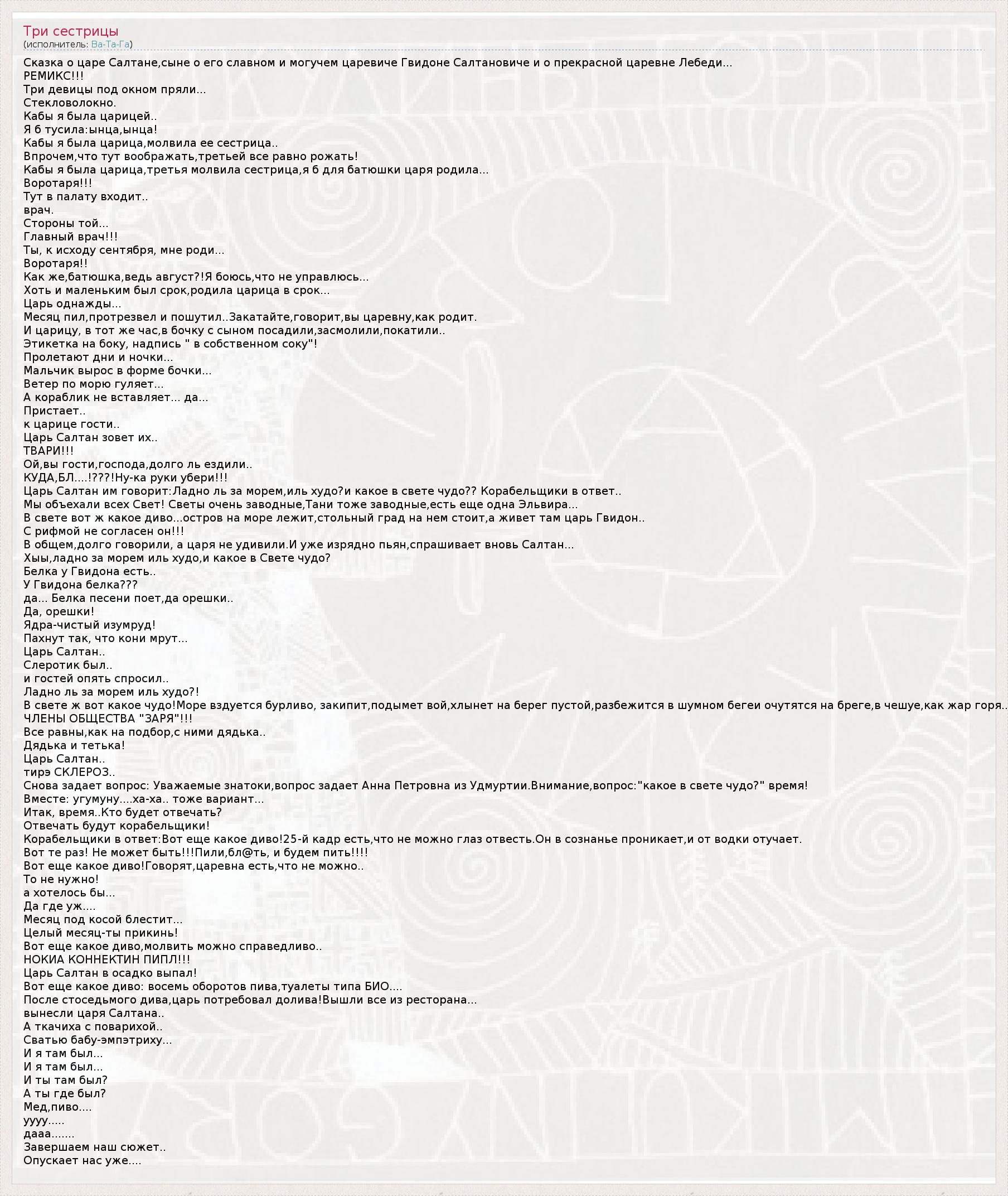 Сказка о царе Салтане,сыне о его славном и могучем царевиче Гвидоне Салтановиче и о прекрасной царевне Лебеди... РЕМИКС!!! Три девицы под окном пряли... Стекловолокно. Кабы я была царицей.. Я б тусила:ынца,ынца! Кабы я была царица,молвила ее сестрица.. Впрочем,что тут воображать,третьей все равно рожать! Кабы я была царица,третья молвила сестрица,я б для батюшки царя родила... Воротаря!!! Тут в палату входит.. врач. Стороны той... Главный врач!!! Ты, к исходу сентября, мне роди... Воротаря!! Как же,батюшка,ведь август?!Я боюсь,что не управлюсь... Хоть и маленьким был срок,родила царица в срок... Царь однажды... Месяц пил,протрезвел и пошутил..Закатайте,говорит,вы царевну,как родит. И царицу, в тот же час,в бочку с сыном посадили,засмолили,покатили.. Этикетка на боку, надпись " в собственном соку"! Пролетают дни и ночки... Мальчик вырос в форме бочки... Ветер по морю гуляет... А кораблик не вставляет... да... Пристает.. к царице гости.. Царь Салтан зовет их.. ТВАРИ!!! Ой,вы гости,господа,долго ль ездили.. КУДА,БЛ....!???!Ну-ка руки убери!!! Царь Салтан им говорит:Ладно ль за морем,иль худо?и какое в свете чудо?? Корабельщики в ответ.. Мы объехали всех Свет! Светы очень заводные,Тани тоже заводные,есть еще одна Эльвира... В свете вот ж какое диво...остров на море лежит,стольный град на нем стоит,а живет там царь Гвидон.. С рифмой не согласен он!!! В общем,долго говорили, а царя не удивили.И уже изрядно пьян,спрашивает вновь Салтан... Хыы,ладно за морем иль худо,и какое в Свете чудо? Белка у Гвидона есть.. У Гвидона белка??? да... Белка песени поет,да орешки.. Да, орешки! Ядра-чистый изумруд! Пахнут так, что кони мрут... Царь Салтан.. Слеротик был.. и гостей опять спросил.. Ладно ль за морем иль худо?! В свете ж вот какое чудо!Море вздуется бурливо, закипит,подымет вой,хлынет на берег пустой,разбежится в шумном бегеи очутятся на бреге,в чешуе,как жар горя.. ЧЛЕНЫ ОБЩЕСТВА "ЗАРЯ"!!! Все равны,как на подбор,с ними дядька.. Дядька и тетька! Царь Салтан.. тирэ СКЛЕРОЗ.. Снова задает вопрос: Уважаемые знатоки,вопрос задает Анна Петровна из Удмуртии.Внимание,вопрос:"какое в свете чудо?" время! Вместе: угумуну....ха-ха.. тоже вариант... Итак, время..Кто будет отвечать? Отвечать будут корабельщики! Корабельщики в ответ:Вот еще какое диво!25-й кадр есть,что не можно глаз отвесть.Он в сознанье проникает,и от водки отучает. Вот те раз! Не может быть!!!Пили,бл@ть, и будем пить!!!! Вот еще какое диво!Говорят,царевна есть,что не можно.. То не нужно! а хотелось бы... Да где уж.... Месяц под косой блестит... Целый месяц-ты прикинь! Вот еще какое диво,молвить можно справедливо.. НОКИА КОННЕКТИН ПИПЛ!!! Царь Салтан в осадко выпал! Вот еще какое диво: восемь оборотов пива,туалеты типа БИО.... После стоседьмого дива,царь потребовал долива!Вышли все из ресторана... вынесли царя Салтана.. А ткачиха с поварихой.. Сватью бабу-эмпэтриху... И я там был... И я там был... И ты там был? А ты где был? Мед,пиво.... уууу..... дааа....... Завершаем наш сюжет.. Опускает нас уже....
