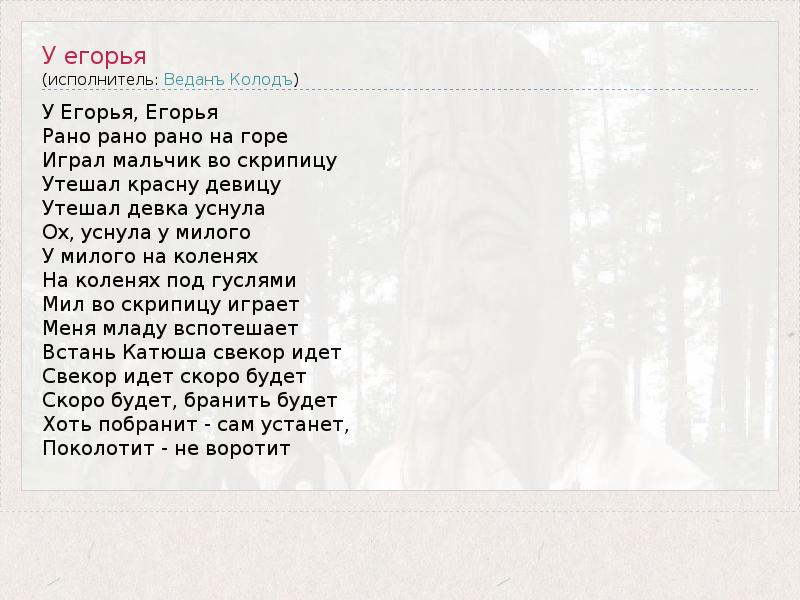 У Егорья, Егорья Рано рано рано на горе Играл мальчик во скрипицу Утешал красну девицу Утешал девка уснула Ох, уснула у милого У милого на коленях На коленях под гуслями Мил во скрипицу играет Меня младу вспотешает Встань Катюша свекор идет Свекор идет скоро будет Скоро будет, бранить будет Хоть побранит - сам устанет, Поколотит - не воротит