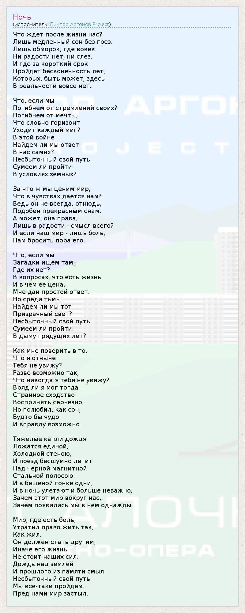 Что ждет после жизни нас? Лишь медленный сон без грез. Лишь обморок, где вовек Ни радости нет, ни слез. И где за короткий срок Пройдет бесконечность лет, Которых, быть может, здесь В реальности вовсе нет. Что, если мы Погибнем от стремлений своих? Погибнем от мечты, Что словно горизонт Уходит каждый миг? В этой войне Найдем ли мы ответ В нас самих? Несбыточный свой путь Сумеем ли пройти В условиях земных? За что ж мы ценим мир, Что в чувствах дается нам? Ведь он не всегда, отнюдь, Подобен прекрасным снам. А может, она права, Лишь в радости - смысл всего? И если наш мир - лишь боль, Нам бросить пора его. Что, если мы Загадки ищем там, Где их нет? В вопросах, что есть жизнь И в чем ее цена, Мне дан простой ответ. Но среди тьмы Найдем ли мы тот Призрачный свет? Несбыточный свой путь Сумеем ли пройти В дыму грядущих лет? Как мне поверить в то, Что я отныне Тебя не увижу? Разве возможно так, Что никогда я тебя не увижу? Вряд ли я мог тогда Странное сходство Воспринять серьезно. Но полюбил, как сон, Будто бы чудо И вправду возможно. Тяжелые капли дождя Ложатся единой, Холодной стеною, И поезд бесшумно летит Над черной магнитной Стальной полосою. И в бешеной гонке одни, И в ночь улетают и больше неважно, Зачем этот мир вокруг нас, Зачем появились мы в нем однажды. Мир, где есть боль, Утратил право жить так, Как жил. Он должен стать другим, Иначе его жизнь Не стоит наших сил. Дождь над землей И прошлого из памяти смыл. Несбыточный свой путь Мы все-таки пройдем. Пред нами мир застыл.
