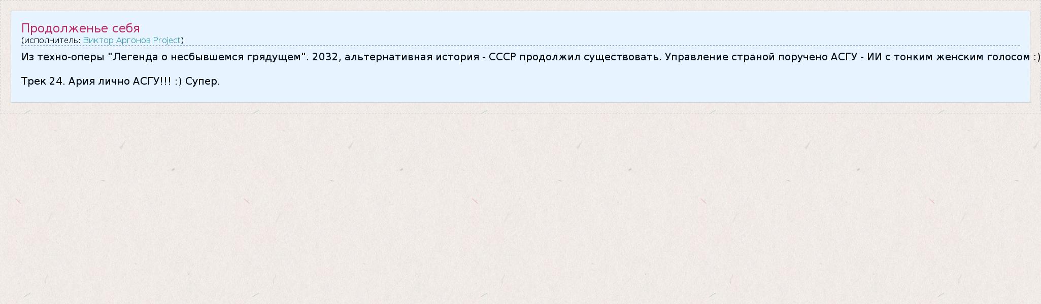 From techno opera & quot; Legend of unrealized upcoming & quot ;. 2032 alternative history - the Soviet Union continued to exist. Managing a country charged with ASGU - AI with a thin female voice :) Track 24. Aria personally ASGU !!! :) Super.