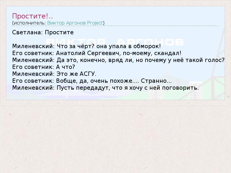 Светлана: Простите Миленевский: Что за чёрт? она упала в обморок! Его советник: Анатолий Сергеевич, по-моему, скандал! Миленевский: Да это, конечно, вряд ли, но почему у неё такой голос? Его советник: А что? Миленевский: Это же АСГУ. Его советник: Вобще, да, очень похоже.... Странно... Миленевский: Пусть передадут, что я хочу с ней поговорить.