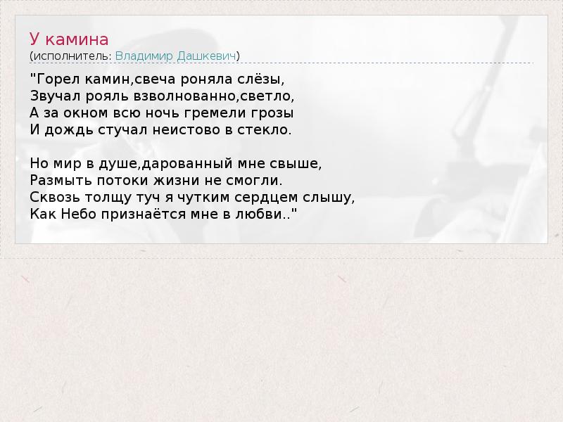 "Горел камин,свеча роняла слёзы, Звучал рояль взволнованно,светло, А за окном всю ночь гремели грозы И дождь стучал неистово в стекло. Но мир в душе,дарованный мне свыше, Размыть потоки жизни не смогли. Сквозь толщу туч я чутким сердцем слышу, Как Небо признаётся мне в любви.."