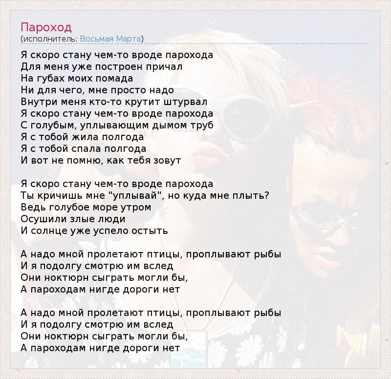 Я скоро стану чем-то вроде парохода Для меня уже построен причал Hа губах моих помада Hи для чего, мне просто надо Внутри меня кто-то крутит штурвал Я скоро стану чем-то вроде парохода С голубым, уплывающим дымом труб Я с тобой жила полгода Я с тобой спала полгода И вот не помню, как тебя зовут Я скоро стану чем-то вроде парохода Ты кричишь мне "уплывай", но куда мне плыть? Ведь голубое море утром Осушили злые люди И солнце уже успело остыть А надо мной пролетают птицы, проплывают рыбы И я подолгу смотрю им вслед Они ноктюрн сыграть могли бы, А пароходам нигде дороги нет А надо мной пролетают птицы, проплывают рыбы И я подолгу смотрю им вслед Они ноктюрн сыграть могли бы, А пароходам нигде дороги нет