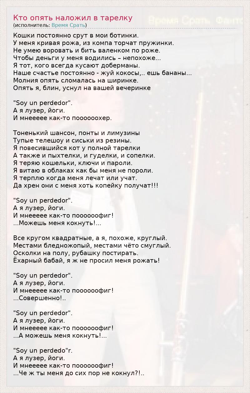 Кошки постоянно срут в мои ботинки. У меня кривая рожа, из компа торчат пружинки. Не умею воровать и бить валенком по роже. Чтобы деньги у меня водились – непохоже... Я тот, кого всегда кусают доберманы. Наше счастье постоянно - жуй кокосы,.. ешь бананы... Молния опять сломалась на ширинке. Опять я, блин, уснул на вашей вечеринке "Soy un perdedor". А я лузер, йоги. И мнеееее как-то поооооохер. Тоненький шансон, понты и лимузины Тупые телешоу и сиськи из резины. Я повесившийся кот у полной тарелки А также и пыхтелки, и гуделки, и сопелки. Я теряю кошельки, ключи и пароли. Я витаю в облаках как бы меня не пороли. Я терплю когда меня лечат или учат. Да хрен они с меня хоть копейку получат!!! "Soy un perdedor". А я лузер, йоги. И мнеееее как-то поооооофиг! ...Можешь меня кокнуть!... Все кругом квадратные, а я, похоже, круглый. Местами бледножопый, местами чёто смуглый. Осколки на полу, рубашку постирать. Ёхарный бабай, я ж не просил меня рожать! "Soy un perdedor". А я лузер, йоги. И мнеееее как-то поооооофиг! ...Совершенно!.. "Soy un perdedor". А я лузер, йоги. И мнеееее как-то поооооофиг! ...А можешь меня кокнуть!... "Soy un perdedo"r. А я лузер, йоги. И мнеееее как-то поооооофиг! ...Че ж ты меня до сих пор не кокнул?!..