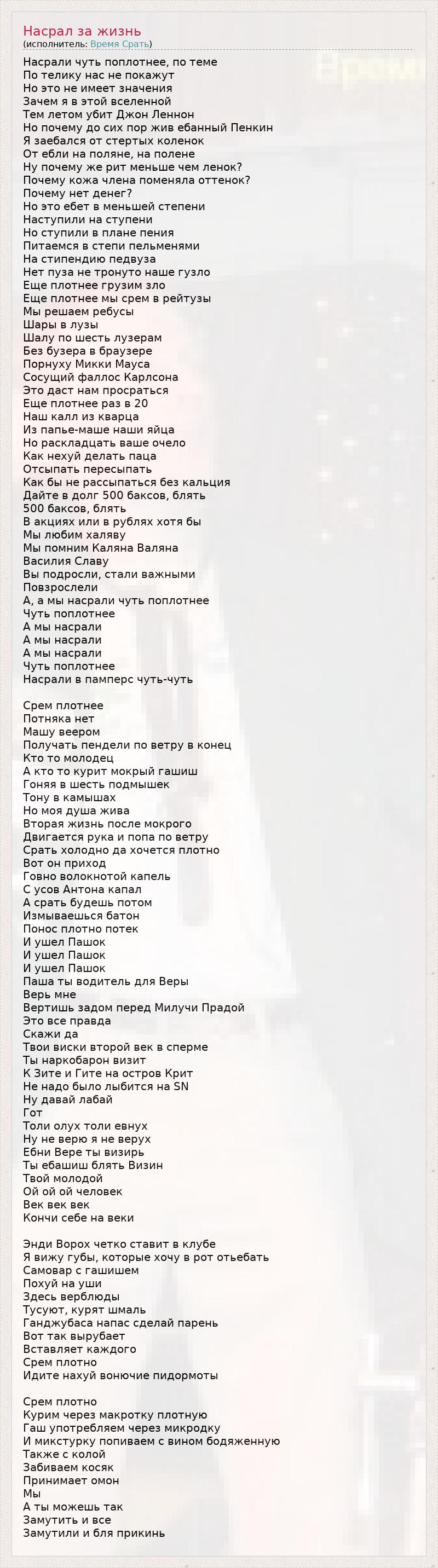 Насрали чуть поплотнее, по теме По телику нас не покажут Но это не имеет значения Зачем я в этой вселенной Тем летом убит Джон Леннон Но почему до сих пор жив ебанный Пенкин Я заебался от стертых коленок От ебли на поляне, на полене Ну почему же рит меньше чем ленок? Почему кожа члена поменяла оттенок? Почему нет денег? Но это ебет в меньшей степени Наступили на ступени Но ступили в плане пения Питаемся в степи пельменями На стипендию педвуза Нет пуза не тронуто наше гузло Еще плотнее грузим зло Еще плотнее мы срем в рейтузы Мы решаем ребусы Шары в лузы Шалу по шесть лузерам Без бузера в браузере Порнуху Микки Мауса Сосущий фаллос Карлсона Это даст нам просраться Еще плотнее раз в 20 Наш калл из кварца Из папье-маше наши яйца Но раскладцать ваше очело Как нехуй делать паца Отсыпать пересыпать Как бы не рассыпаться без кальция Дайте в долг 500 баксов, блять 500 баксов, блять В акциях или в рублях хотя бы Мы любим халяву Мы помним Каляна Валяна Василия Славу Вы подросли, стали важными Повзрослели А, а мы насрали чуть поплотнее Чуть поплотнее А мы насрали А мы насрали А мы насрали Чуть поплотнее Насрали в памперс чуть-чуть Срем плотнее Потняка нет Машу веером Получать пендели по ветру в конец Кто то молодец А кто то курит мокрый гашиш Гоняя в шесть подмышек Тону в камышах Но моя душа жива Вторая жизнь после мокрого Двигается рука и попа по ветру Срать холодно да хочется плотно Вот он приход Говно волокнотой капель С усов Антона капал А срать будешь потом Измываешься батон Понос плотно потек И ушел Пашок И ушел Пашок И ушел Пашок Паша ты водитель для Веры Верь мне Вертишь задом перед Милучи Прадой Это все правда Скажи да Твои виски второй век в сперме Ты наркобарон визит К Зите и Гите на остров Крит Не надо было лыбится на SN Ну давай лабай Гот Толи олух толи евнух Ну не верю я не верух Ебни Вере ты визирь Ты ебашиш блять Визин Твой молодой Ой ой ой человек Век век век Кончи себе на веки Энди Ворох четко ставит в клубе Я вижу губы, которые хочу в рот отьебать Самовар с гашишем Похуй на уши Здесь верблюды Тусуют, курят шмаль Ганджубаса напас сделай парень Вот так вырубает Вставляет каждого Срем плотно Идите нахуй вонючие пидормоты Срем плотно Курим через макротку плотную Гаш употребляем через микродку И микстурку попиваем с вином бодяженную Также с колой Забиваем косяк Принимает омон Мы А ты можешь так Замутить и все Замутили и бля прикинь