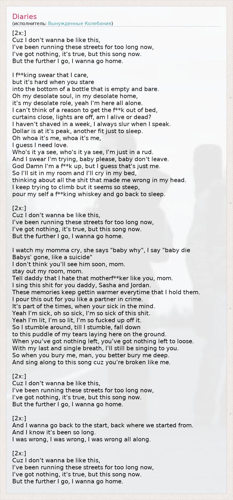 [2x:] Я не хочу быть таким, Я уже слишком долго бегу по этим улицам, У меня действительно больше ничего нет, кроме этой песни, Но чем дольше все это длится, тем больше я хочу вернуться домой. К черту, клянусь, мне не все равно, Но это тяжело, когда пялишься на дно бутылки, А она абсолютно пуста. О, моя одинокая душа, в моем одиноком доме, Это моя одинокая роль, да, я здесь совсем один. Я не вижу смысла поднимать задницу с кровати, Шторы задвинуты, свет выключен, я жив или мертв? Я неделю не брился, я разучился внятно говорить, Цены на доллар взлетели - еще один повод тупо спать. Вау, каким я стал, вау, до чего дошел, Подозреваю, что мне не хватает любви, Кого мы видим, кого мы видим - это я заблудился в жизни. Клянусь, я пытаюсь, малыш, пожалуйста, постой, Черт, я в полной дыре, но, думаю, это моя суть. Так что буду торчать в своей комнате и рыдать в постели, Думая о всем том говне, от которого у меня поехала крыша. Я все пытаюсь карабкаться, но подъем слишком крут, Наливаю себе греб*ного виски и иду обратно спать. [2x:] Я не хочу быть таким, Я уже слишком долго бегу по этим улицам, У меня действительно больше ничего нет, кроме этой песни, Но чем дольше все это длится, тем больше я хочу вернуться домой. Я смотрю, как моя мама плачет, она говорит: "Малыш, почему?", Я говорю: "Малыш умер, малыша нет, типа самоубийство, И не думаю, что ты скоро увидишь своего малыша, мам, Так что не заходи ко мне в комнату, мам, Передай папе, что я его, сволочь, ненавижу, как и тебя, мам". Я посвящаю песню вам, папа, Саша и Джордан, Воспоминания ярче, как только я их касаюсь, Я изливаю душу для вас, как соучастник преступления, Это просто часть состояния схождения с ума. Да, меня тошнит, очень тошнит, тошнит от этого говна, Да, я взбешен, очень взбешен, меня достало это все. Я буду спотыкаясь идти, пока не споткнусь окончательно И не упаду на землю, в лужу собственных слез. Когда у тебя не осталось ничего, то нечего терять, На одном последнем вздохе я все еще буду петь вам, А когда будешь хоронить меня, друг, закопай меня поглубже, И присоединяйся к этой песне, ведь ты сломан, как и я. [2x:] Я не хочу быть таким, Я уже слишком долго бегу по этим улицам, У меня действительно больше ничего нет, кроме этой песни, Но чем дольше все это длится, тем больше я хочу вернуться домой. [2x:] Я хочу вернуться к началу, к тому, с чего все началось, Я знаю, что прошло очень много времени, И я был неправ, я был неправ, все это время был неправ. [2x:] Я не хочу быть таким, Я уже слишком долго бегу по этим улицам, У меня действительно больше ничего нет, кроме этой песни, Но чем дольше все это длится, тем больше я хочу вернуться домой.