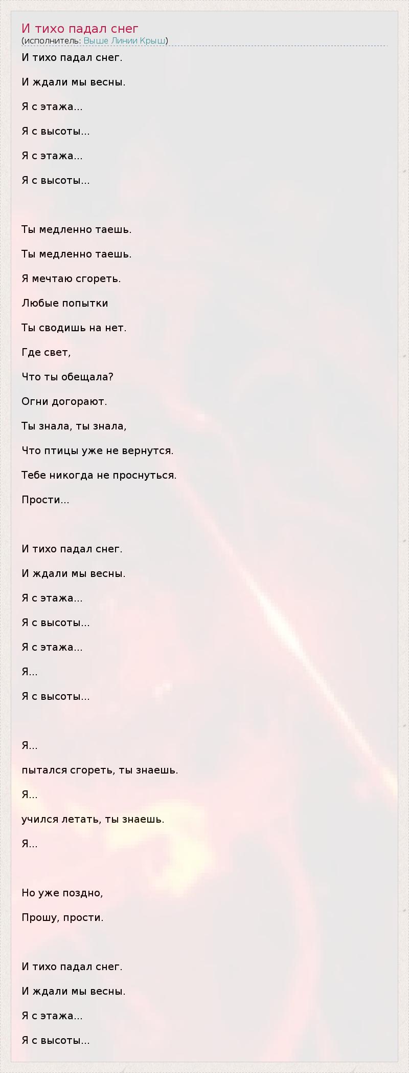 И тихо падал снег. И ждали мы весны. Я с этажа... Я с высоты... Я с этажа... Я с высоты... Ты медленно таешь. Ты медленно таешь. Я мечтаю сгореть. Любые попытки Ты сводишь на нет. Где свет, Что ты обещала? Огни догорают. Ты знала, ты знала, Что птицы уже не вернутся. Тебе никогда не проснуться. Прости... И тихо падал снег. И ждали мы весны. Я с этажа... Я с высоты... Я с этажа... Я... Я с высоты... Я... пытался сгореть, ты знаешь. Я... учился летать, ты знаешь. Я... Но уже поздно, Прошу, прости. И тихо падал снег. И ждали мы весны. Я с этажа... Я с высоты...