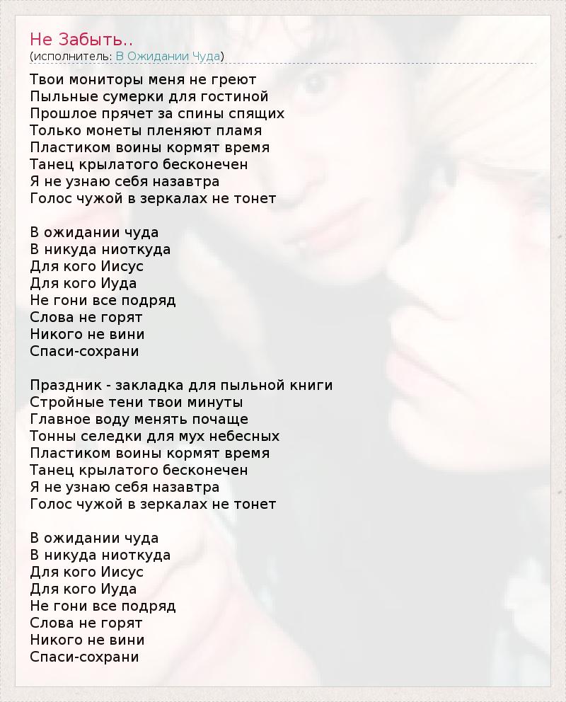Твои мониторы меня не греют Пыльные сумерки для гостиной Прошлое прячет за спины спящих Только монеты пленяют пламя Пластиком воины кормят время Танец крылатого бесконечен Я не узнаю себя назавтра Голос чужой в зеркалах не тонет В ожидании чуда В никуда ниоткуда Для кого Иисус Для кого Иуда Не гони все подряд Слова не горят Никого не вини Спаси-сохрани Праздник - закладка для пыльной книги Стройные тени твои минуты Главное воду менять почаще Тонны селедки для мух небесных Пластиком воины кормят время Танец крылатого бесконечен Я не узнаю себя назавтра Голос чужой в зеркалах не тонет В ожидании чуда В никуда ниоткуда Для кого Иисус Для кого Иуда Не гони все подряд Слова не горят Никого не вини Спаси-сохрани