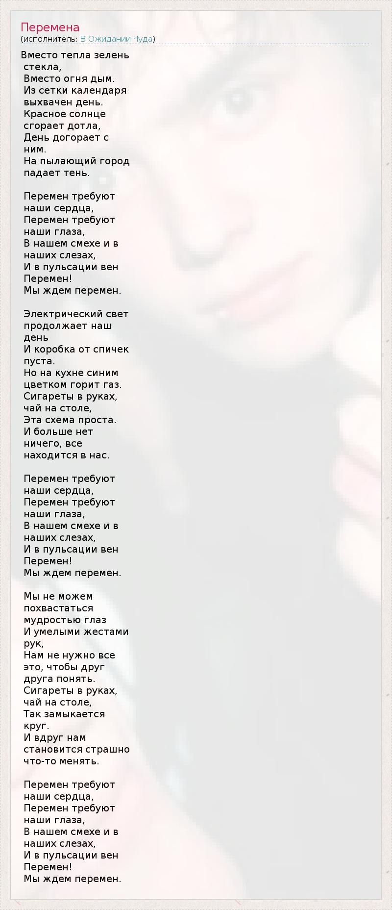 Вместо тепла зелень стекла, Вместо огня дым. Из сетки календаря выхвачен день. Красное солнце сгорает дотла, День догорает с ним. На пылающий город падает тень. Перемен требуют наши сердца, Перемен требуют наши глаза, В нашем смехе и в наших слезах, И в пульсации вен Перемен! Мы ждем перемен. Электрический свет продолжает наш день И коробка от спичек пуста. Но на кухне синим цветком горит газ. Сигареты в руках, чай на столе, Эта схема проста. И больше нет ничего, все находится в нас. Перемен требуют наши сердца, Перемен требуют наши глаза, В нашем смехе и в наших слезах, И в пульсации вен Перемен! Мы ждем перемен. Мы не можем похвастаться мудростью глаз И умелыми жестами рук, Нам не нужно все это, чтобы друг друга понять. Сигареты в руках, чай на столе, Так замыкается круг. И вдруг нам становится страшно что-то менять. Перемен требуют наши сердца, Перемен требуют наши глаза, В нашем смехе и в наших слезах, И в пульсации вен Перемен! Мы ждем перемен.