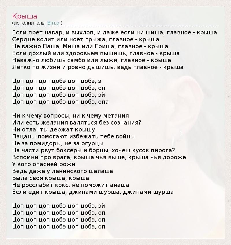 Если прет навар, и выхлоп, и даже если ни шиша, главное - крыша Сердце колит или ноет грыжа, главное - крыша Не важно Паша, Миша или Гриша, главное - крыша Если дохлый или здоровьем пышишь, главное - крыша Неважно любишь самбо или лыжи, главное - крыша Легко по жизни и ровно дышишь, ведь главное - крыша Цоп цоп цоп цобэ цоп цобэ, э Цоп цоп цоп цобэ цоп цобэ, оп Цоп цоп цоп цобэ цоп цобэ, эй Цоп цоп цоп цобэ цоп цобэ, опа Ни к чему вопросы, ни к чему метания Или есть желания валяться без сознания? Ни отланты держат крышу Пацаны помогают избежать тебе войны Не за помидоры, не за огурцы На части рвут боксеры и борцы, хочеш кусок пирога? Вспомни про врага, крыша чья выше, крыша чья дороже У кого опасней рожи Ведь даже у ленинского шалаша Была своя крыша, крыша Не росслабит кокс, не поможит анаша Если едит крыша, джипами шурша, джипами шурша Цоп цоп цоп цобэ цоп цобэ, эй Цоп цоп цоп цобэ цоп цобэ, оп Цоп цоп цоп цобэ цоп цобэ, оп Цоп цоп цоп цобэ цоп цобэ, оп