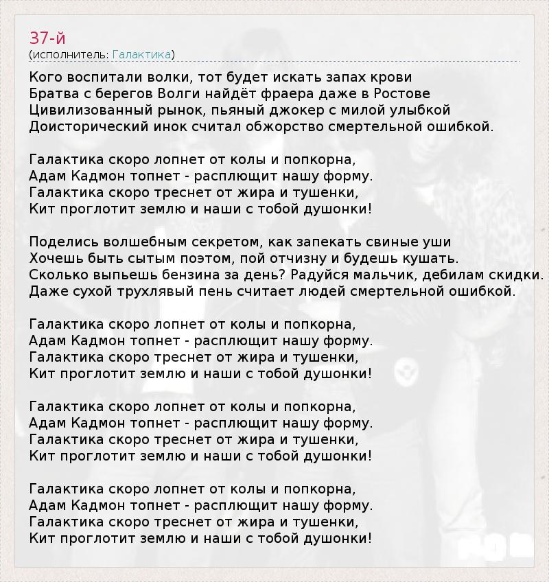 Кого воспитали волки, тот будет искать запах крови Братва с берегов Волги найдёт фраера даже в Ростове Цивилизованный рынок, пьяный джокер с милой улыбкой Доисторический инок считал обжорство смертельной ошибкой. Галактика скоро лопнет от колы и попкорна, Адам Кадмон топнет - расплющит нашу форму. Галактика скоро треснет от жира и тушенки, Кит проглотит землю и наши с тобой душонки! Поделись волшебным секретом, как запекать свиные уши Хочешь быть сытым поэтом, пой отчизну и будешь кушать. Сколько выпьешь бензина за день? Радуйся мальчик, дебилам скидки. Даже сухой трухлявый пень считает людей смертельной ошибкой. Галактика скоро лопнет от колы и попкорна, Адам Кадмон топнет - расплющит нашу форму. Галактика скоро треснет от жира и тушенки, Кит проглотит землю и наши с тобой душонки! Галактика скоро лопнет от колы и попкорна, Адам Кадмон топнет - расплющит нашу форму. Галактика скоро треснет от жира и тушенки, Кит проглотит землю и наши с тобой душонки! Галактика скоро лопнет от колы и попкорна, Адам Кадмон топнет - расплющит нашу форму. Галактика скоро треснет от жира и тушенки, Кит проглотит землю и наши с тобой душонки!