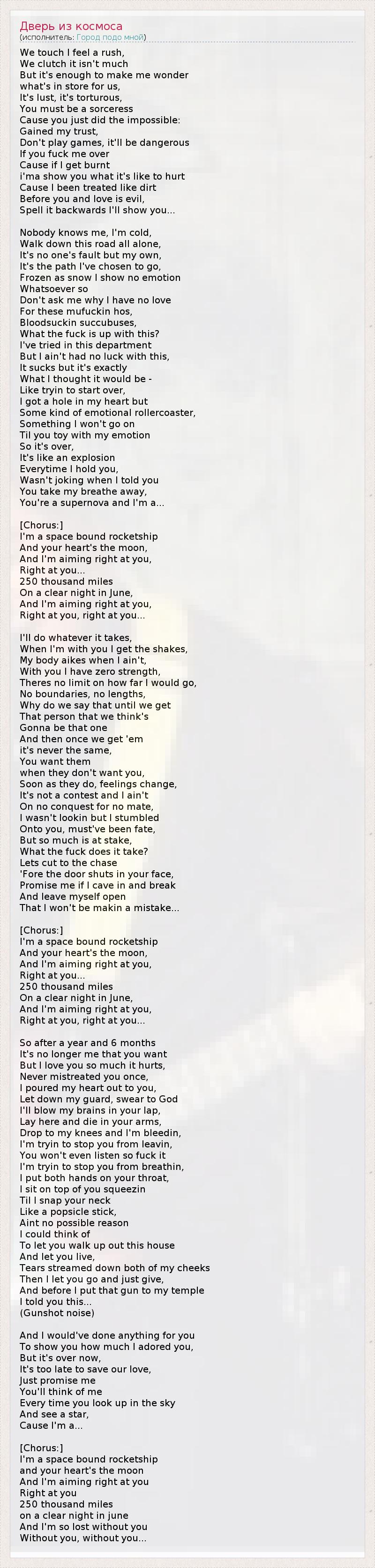 От прикосновений колотится сердце, Мы обнимаемся - это немного, Но достаточно для того, чтобы я Начал думать о нашем будущем. Это страсть, это мучительно, Ты, наверное, колдунья, потому что Только что сделала невозможное: Завоевала мое доверие. Не играй со мной в игры, это опасно, Не пытайся использовать меня и уйти, Потому что если я обожгусь, То покажу тебе, что такое боль, Ведь до тебя меня топтали, как грязь, А любовь - это зло, Произнеси наоборот и поймешь*... Меня никто не знает, я холоден, Иду по этой дороге совсем один, Но никто не виноват, только я, Ведь я сам выбрал свой путь. Ледяной, как снег, я не проявляю Совершенно никаких эмоций, так что Не спрашивайте, почему я ненавижу Всех этих гребаных шл*х, Этих вампирок-кровопиец, Да что с ними, с*ка, такое? Я пытался завести отношения, Но каждый раз неудачно, Все было отстойно, хотя именно так, Как я и думал - Просто попытки начать все сначала, У меня пустота в сердце, но Эмоции бесконтрольно скачут, Порой меня не завести, пока Не станешь играть с моими чувствами - А тогда чувства исчезают, Внутри словно все взрывается Каждый раз, когда обнимаю тебя, Я не шутил, когда сказал, Что от тебя захватывает дух, Ты - сверхновая звезда, а я... [Припев:] Я ракета, летящая в космос, А твое сердце - луна, И я целюсь прямо в тебя, Прямо в тебя. До тебя 250 тысяч миль Ясной ночью в июне, И я целюсь прямо в тебя, Прямо в тебя, прямо в тебя. Я готов сделать что угодно, Когда я с тобой - мурашки по телу, Когда без тебя - все тело болит, С тобой все мои силы на нуле, И я могу зайти сколь угодно далеко, Нет этому границ и пределов. Почему все мы говорим это, пока Не добьемся того человека, который, Как мы думаем, тот единственный? А когда добьемся - Все уже совсем по-другому: Ты хочешь ее, когда она тебя не хочет, А как только захочет, Уже твои чувства переменятся. Это не конкурс, и я не стремлюсь Завоевать чье-либо сердце, Я не искал, просто наткнулся на тебя, Это точно была судьба, Но очень многое поставлено на карту, Какова же цена, черт побери? Бежим в погоню за счастьем, пока Дверь не захлопнулась перед носом, Пообещай мне, что если я сдамся, Сломаюсь и откроюсь перед тобой, Это не будет моей ошибкой... [Припев:] Я ракета, летящая в космос, А твое сердце - луна, И я целюсь прямо в тебя, Прямо в тебя. До тебя 250 тысяч миль Ясной ночью в июне, И я целюсь прямо в тебя, Прямо в тебя, прямо в тебя. Прошел год и шесть месяцев, И тебе уже нужен не я, а другой, Но я так сильно люблю тебя, до боли, Я ни разу ничем тебя не обидел, Я выложил перед тобой свою душу, Скинул защитную броню, Перед Богом клянусь, я мог бы Прострелить себе мозги при тебе, Лечь и умереть у тебя на руках. Я падаю на колени, истекаю кровью, Пытаюсь удержать тебя, не дать уйти, Ты даже не слушаешь, что ж, с*ка, Я пытаюсь не дать тебе вздохнуть, Подминаю под себя и начинаю душить, Пока твоя шея не хрустнет, Как палочка от мороженого. Я совершенно не вижу Ни единой причины, по которой мог бы Позволить тебе уйти из этого дома И жить дальше без меня, Слезы текли по обеим щекам, а потом Я отпустил тебя, просто вот так, И приставил пистолет себе к виску, Но перед этим сказал... (Звук выстрела) Я готов был сделать что угодно, Чтобы ты увидела, Насколько я боготворю тебя, Но теперь все кончено, Слишком поздно спасать нашу любовь, Просто пообещай, что будешь Думать обо мне каждый раз, Когда посмотришь на небо И увидишь звезду, ведь 