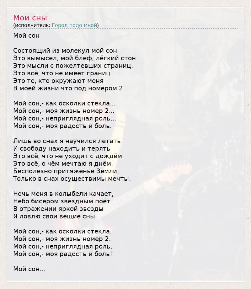 Мой сон Состоящий из молекул мой сон Это вымысел, мой блеф, лёгкий стон. Это мысли с пожелтевших страниц. Это всё, что не имеет границ. Это те, кто окружают меня В моей жизни что под номером 2. Мой сон,- как осколки стекла... Мой сон,- моя жизнь номер 2... Мой сон,- неприглядная роль... Мой сон,- моя радость и боль. Лишь во снах я научился летать И свободу находить и терять Это всё, что не уходит с дождём Это всё, о чём мечтаю я днём. Бесполезно притяженье Земли, Только в снах осуществимы мечты. Ночь меня в колыбели качает, Небо бисером звёздным поёт. В отражении яркой звезды Я ловлю свои вещие сны. Мой сон,- как осколки стекла. Мой сон,- моя жизнь номер 2. Мой сон,- неприглядная роль. Мой сон,- моя радость и боль! Мой сон...