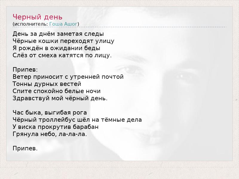 День за днём заметая следы Чёрные кошки переходят улицу Я рождён в ожидании беды Слёз от смеха катятся по лицу. Припев: Ветер приносит с утренней почтой Тонны дурных вестей Спите спокойно белые ночи Здравствуй мой чёрный день. Час быка, выгибая рога Чёрный троллейбус шёл на тёмные дела У виска прокрутив барабан Грянула небо, ла-ла-ла. Припев.
