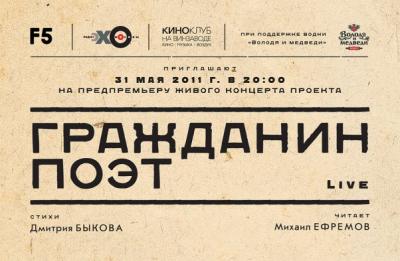 «Граждани́н поэ́т» — первоначально, телевизионный проект телеканала «Дождь» (первые пять выпусков прошли на нём под заголовком «Поэт и гражданин») и продюсера Андрея Васильева, в котором заслуженный артист Российской Федерации Михаил Ефремов читает стихи на «злобу дня», написанные Дмитрием Быковым в жанре политической сатиры на манер известных писателей и поэтов. В настоящее... продолжение