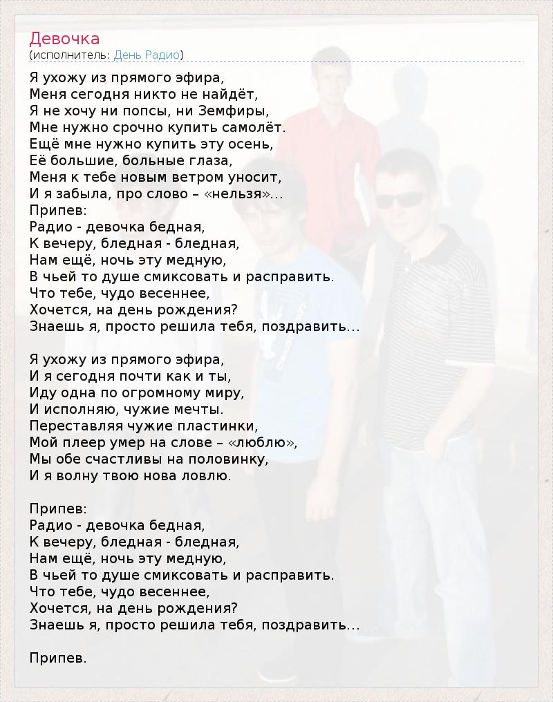 Я ухожу из прямого эфира, Меня сегодня никто не найдёт, Я не хочу ни попсы, ни Земфиры, Мне нужно срочно купить самолёт. Ещё мне нужно купить эту осень, Её большие, больные глаза, Меня к тебе новым ветром уносит, И я забыла, про слово – «нельзя»… Припев: Радио - девочка бедная, К вечеру, бледная - бледная, Нам ещё, ночь эту медную, В чьей то душе смиксовать и расправить. Что тебе, чудо весеннее, Хочется, на день рождения? Знаешь я, просто решила тебя, поздравить… Я ухожу из прямого эфира, И я сегодня почти как и ты, Иду одна по огромному миру, И исполняю, чужие мечты. Переставляя чужие пластинки, Мой плеер умер на слове – «люблю», Мы обе счастливы на половинку, И я волну твою нова ловлю. Припев: Радио - девочка бедная, К вечеру, бледная - бледная, Нам ещё, ночь эту медную, В чьей то душе смиксовать и расправить. Что тебе, чудо весеннее, Хочется, на день рождения? Знаешь я, просто решила тебя, поздравить… Припев.