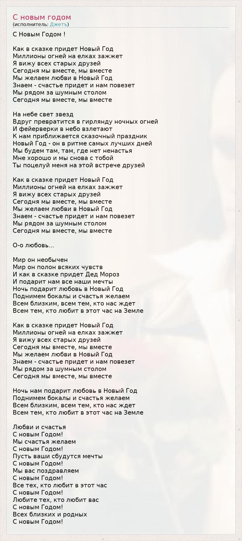 С Новым Годом ! Как в сказке придет Новый Год Миллионы огней на елках зажжет Я вижу всех старых друзей Сегодня мы вместе, мы вместе Мы желаем любви в Новый Год Знаем - счастье придет и нам повезет Мы рядом за шумным столом Сегодня мы вместе, мы вместе На небе свет звезд Вдруг превратится в гирлянду ночных огней И фейерверки в небо взлетают К нам приближается сказочный праздник Новый Год - он в ритме самых лучших дней Мы будем там, там, где нет ненастья Мне хорошо и мы снова с тобой Ты поцелуй меня на этой встрече друзей Как в сказке придет Новый Год Миллионы огней на елках зажжет Я вижу всех старых друзей Сегодня мы вместе, мы вместе Мы желаем любви в Новый Год Знаем - счастье придет и нам повезет Мы рядом за шумным столом Сегодня мы вместе, мы вместе О-о любовь... Мир он необычен Мир он полон всяких чувств И как в сказке придет Дед Мороз И подарит нам все наши мечты Ночь подарит любовь в Новый Год Поднимем бокалы и счастья желаем Всем близким, всем тем, кто нас ждет Всем тем, кто любит в этот час на Земле Как в сказке придет Новый Год Миллионы огней на елках зажжет Я вижу всех старых друзей Сегодня мы вместе, мы вместе Мы желаем любви в Новый Год Знаем - счастье придет и нам повезет Мы рядом за шумным столом Сегодня мы вместе, мы вместе Ночь нам подарит любовь в Новый Год Поднимем бокалы и счастья желаем Всем близким, всем тем, кто нас ждет Всем тем, кто любит в этот час на Земле Любви и счастья С новым Годом! Мы счастья желаем С новым Годом! Пусть ваши сбудутся мечты С новым Годом! Мы вас поздравляем С новым Годом! Все тех, кто любит в этот час С новым Годом! Любите тех, кто любит вас С новым Годом! Всех близких и родных С новым Годом!