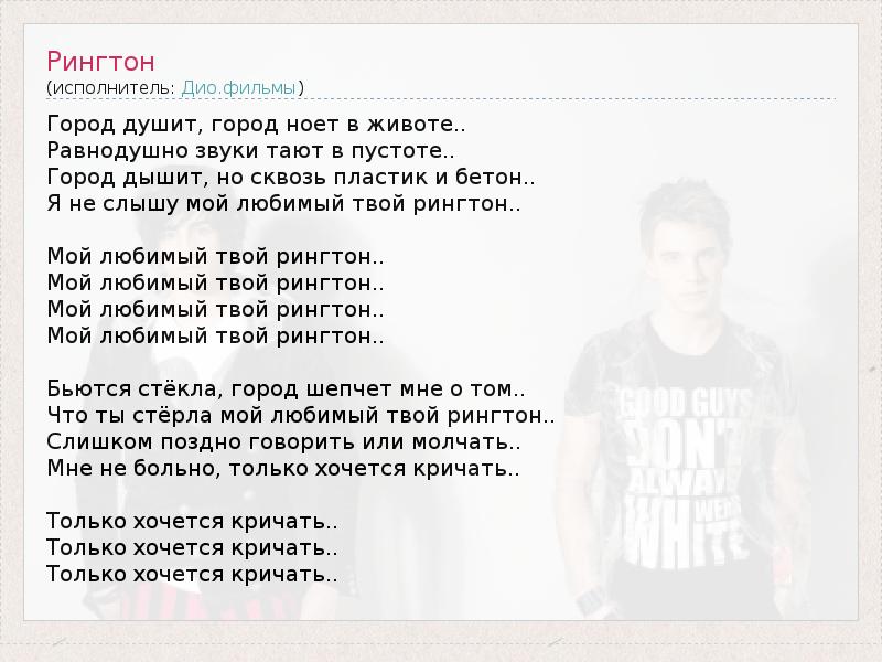 Город душит, город ноет в животе.. Равнодушно звуки тают в пустоте.. Город дышит, но сквозь пластик и бетон.. Я не слышу мой любимый твой рингтон.. Мой любимый твой рингтон.. Мой любимый твой рингтон.. Мой любимый твой рингтон.. Мой любимый твой рингтон.. Бьются стёкла, город шепчет мне о том.. Что ты стёрла мой любимый твой рингтон.. Слишком поздно говорить или молчать.. Мне не больно, только хочется кричать.. Только хочется кричать.. Только хочется кричать.. Только хочется кричать..