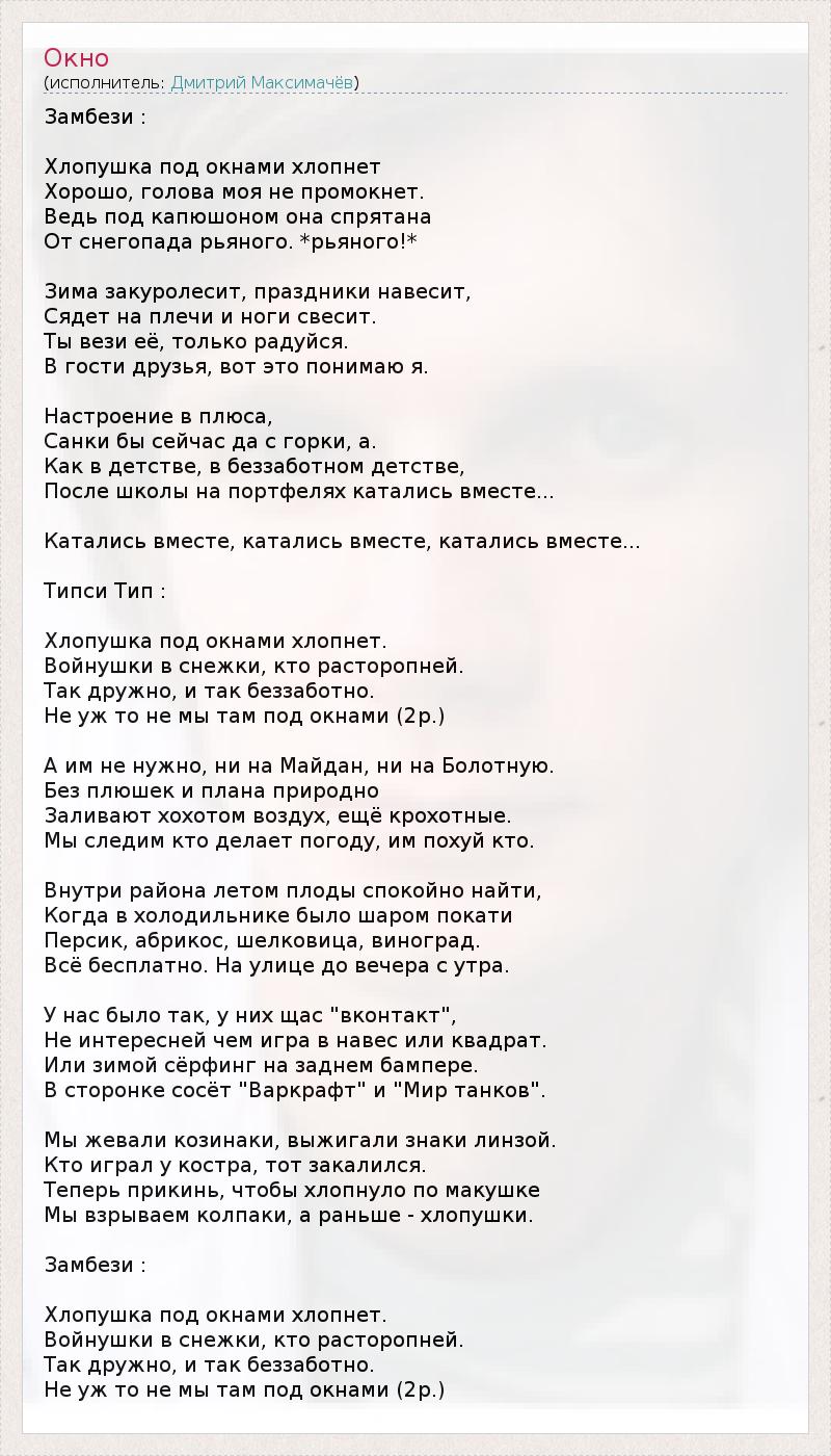 Замбези : Хлопушка под окнами хлопнет Хорошо, голова моя не промокнет. Ведь под капюшоном она спрятана От снегопада рьяного. *рьяного!* Зима закуролесит, праздники навесит, Сядет на плечи и ноги свесит. Ты вези её, только радуйся. В гости друзья, вот это понимаю я. Настроение в плюса, Санки бы сейчас да с горки, а. Как в детстве, в беззаботном детстве, После школы на портфелях катались вместе... Катались вместе, катались вместе, катались вместе... Типси Тип : Хлопушка под окнами хлопнет. Войнушки в снежки, кто расторопней. Так дружно, и так беззаботно. Не уж то не мы там под окнами (2р.) А им не нужно, ни на Майдан, ни на Болотную. Без плюшек и плана природно Заливают хохотом воздух, ещё крохотные. Мы следим кто делает погоду, им похуй кто. Внутри района летом плоды спокойно найти, Когда в холодильнике было шаром покати Персик, абрикос, шелковица, виноград. Всё бесплатно. На улице до вечера с утра. У нас было так, у них щас "вконтакт", Не интересней чем игра в навес или квадрат. Или зимой сёрфинг на заднем бампере. В сторонке сосёт "Варкрафт" и "Мир танков". Мы жевали козинаки, выжигали знаки линзой. Кто играл у костра, тот закалился. Теперь прикинь, чтобы хлопнуло по макушке Мы взрываем колпаки, а раньше - хлопушки. Замбези : Хлопушка под окнами хлопнет. Войнушки в снежки, кто расторопней. Так дружно, и так беззаботно. Не уж то не мы там под окнами (2р.)