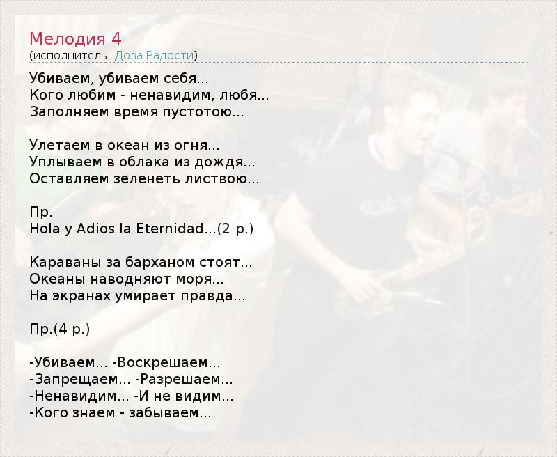 Kill, kill yourself ... We love - hate , love ... Fill the empty time ... Fly away into the ocean of fire ... Float away in a cloud of rain ... We reserve green foliage ... Pr . Hola y Adios la Eternidad ... ( 2 p . ) Caravans for dunes are ... Oceans flood the sea ... The screens dies truth ... Ave. (4 p . ) -Ubivaem ... -Voskreshaem ... -Zapreschaem ... The solving ... -Nenavidim ... -And Do not see ... -Who Know - forget ...