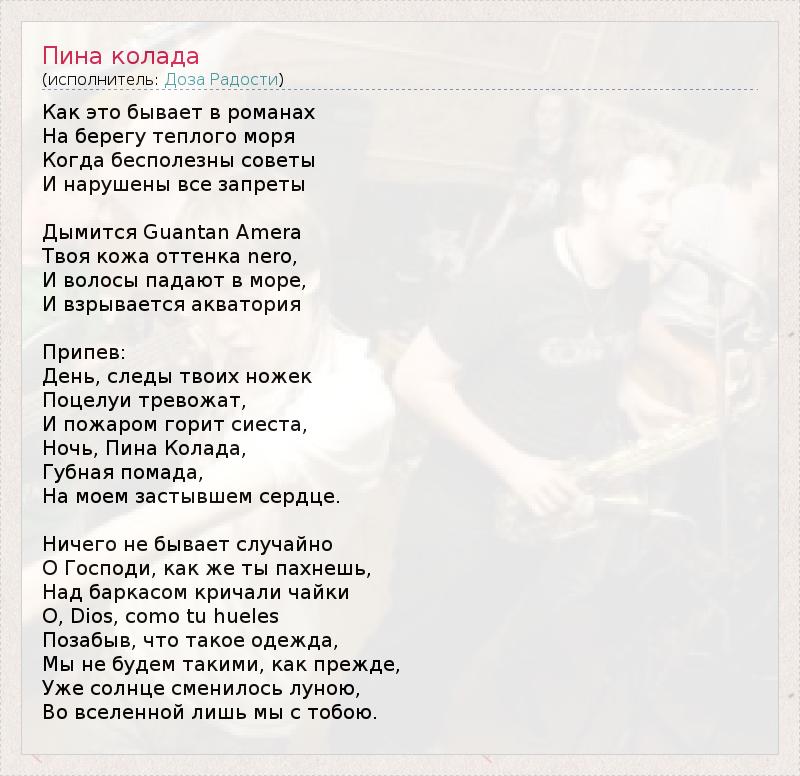 Как это бывает в романах На берегу теплого моря Когда бесполезны советы И нарушены все запреты Дымится Guantan Amera Твоя кожа оттенка nero, И волосы падают в море, И взрывается акватория Припев: День, следы твоих ножек Поцелуи тревожат, И пожаром горит сиеста, Ночь, Пина Колада, Губная помада, На моем застывшем сердце. Ничего не бывает случайно О Господи, как же ты пахнешь, Над баркасом кричали чайки O, Dios, como tu hueles Позабыв, что такое одежда, Мы не будем такими, как прежде, Уже солнце сменилось луною, Во вселенной лишь мы с тобою.